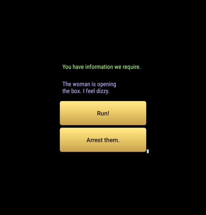 Swager7, когда те двое говори так: 1. Спроси её кто она, 2. Уходи оттуда, 3. Беги, ты должен выбраться оттуда