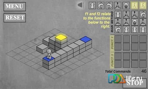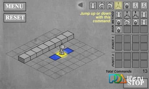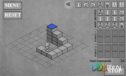 Итак, беритесь за команды и начинайте. Уровни разбиты на квадраты для легкости подсчета клеточек. Например, нужно сделать два шага вперёд, повернуть направо, пройти еще один шаг вперед и зажечь свет. Выставляем команды: вперед, вперед, направо, вперед, свет.
