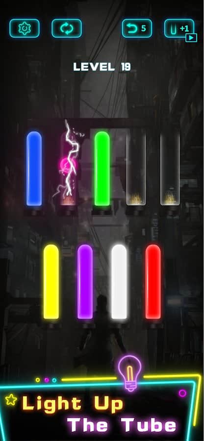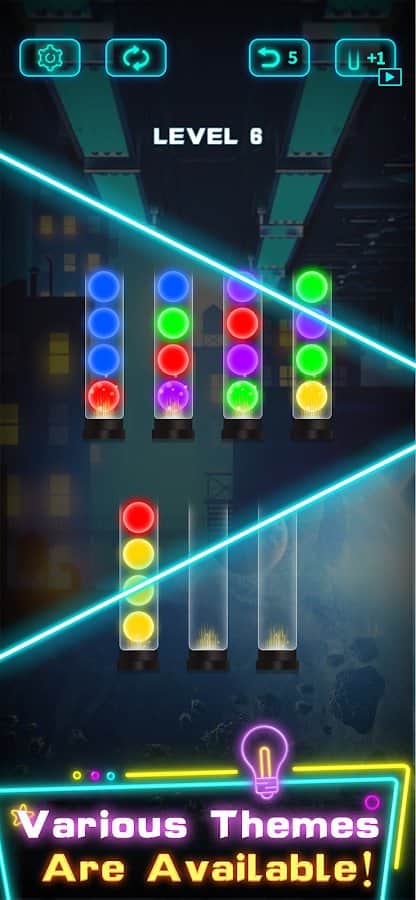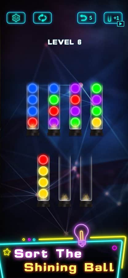 Наверняка все уже знакомы с новой головоломкой переливания цветной воды в колбы, но видели ли вы игру где нужно перемещать цветные шары? Тогда добро пожаловать в уникальную игру Light Sort Puzzle, где собрано больше 30 уровней разной сложности. Наполните колбы неоновыми цветами, собрав целую палитру в правильных местах. Чтобы перемещать шары с колбы в колбу, выберите сначала что хотите переместить, а затем на колбу куда нужно поставить. Если не можете найти способ разгадать головоломку - воспользуйтесь дополнительной колбой.