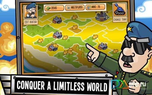 Little Generals - это война двух генералов, один из которых - это Вы. Игра очень напоминает легкую и яркую, а также очень известную игру Worms. Только в отличие от червячков, в качестве боевой единицы у вас всего один танк, но это отнюдь не делает игру скучной, а наоборот, добавляет вам лишь боевого азарта. Ваша главная задача - захватить всю территорию соперника, которая на карте разделена на области. Вы можете захватывать только ту область, которая соседствует с той, на которой находитесь вы сейчас. В ходе боевых действий вы сможете передвигаться по полю, но для этого нужно покупать топливо на деньги, полученные за выигранные бои. Если нет возможности купить топливо, ваш танк превращается в стационарную боевую точку, и это лишает вас тактических действий, но все зависит от вашей стратегии и прозорливости. Шутки генералов и награждение медалями за победы лишь добавляет шарма этой веселой стратегии!