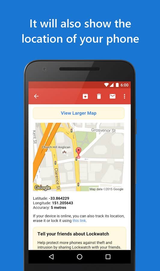 Lockwatch - Thief Catcher - Боитесь что ваш смартфон могут украсть? Обезопасьте себя, с помощью этого простого приложения. Что бы защитить себя и ваш смартфон, введите специальный пароль, и когда злоумышленник, попытается разблокировать его, подбирая различные комбинации, приложение само отправит вам его фото, а так же гео данные о его местоположении. Тем самым вы очень упростите жизнь себе и работникам полиции. Которые в следствии разыщут этого человека, и вернут вам, ваше драгоценное устройство.