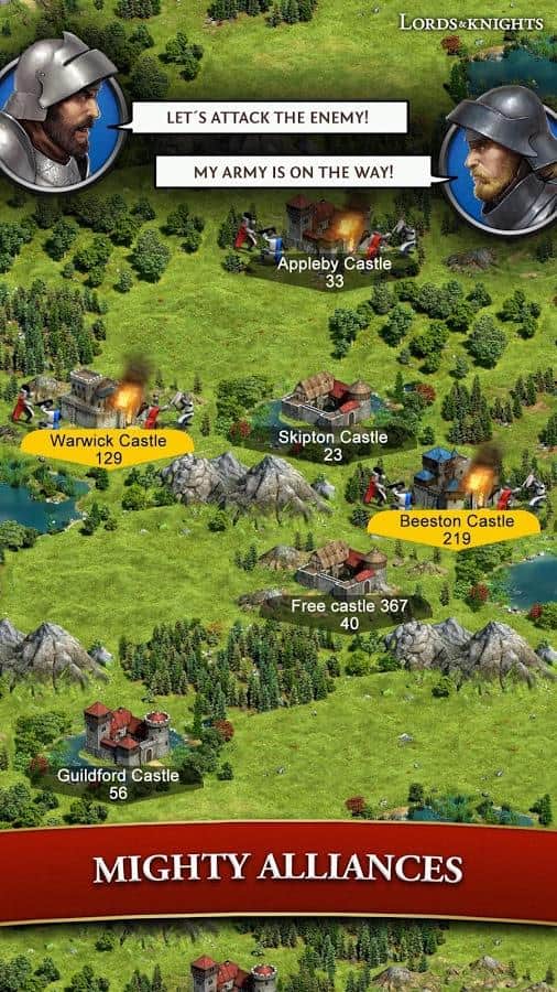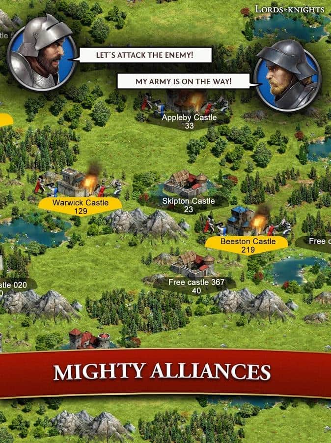 Lords & Knights - Strategy MMO - Играть против ИИ стало уже давно не весело, и вот разработчики данной игры решили порадовать нас толковой стратегией. Данная игра была основана на сборе данных о браузерных стратегиях на ПК. Она очень напоминает весьма известную игру Травиан/Travian. А напоминает она её тем, что карта здесь построена таким же образом. В самом начале игры вы будете лордом маленького форта, который со временем будет расширятся и приносить больше прибыли, а значит вы сможете увеличить войско, и захватить ещё больше земель.