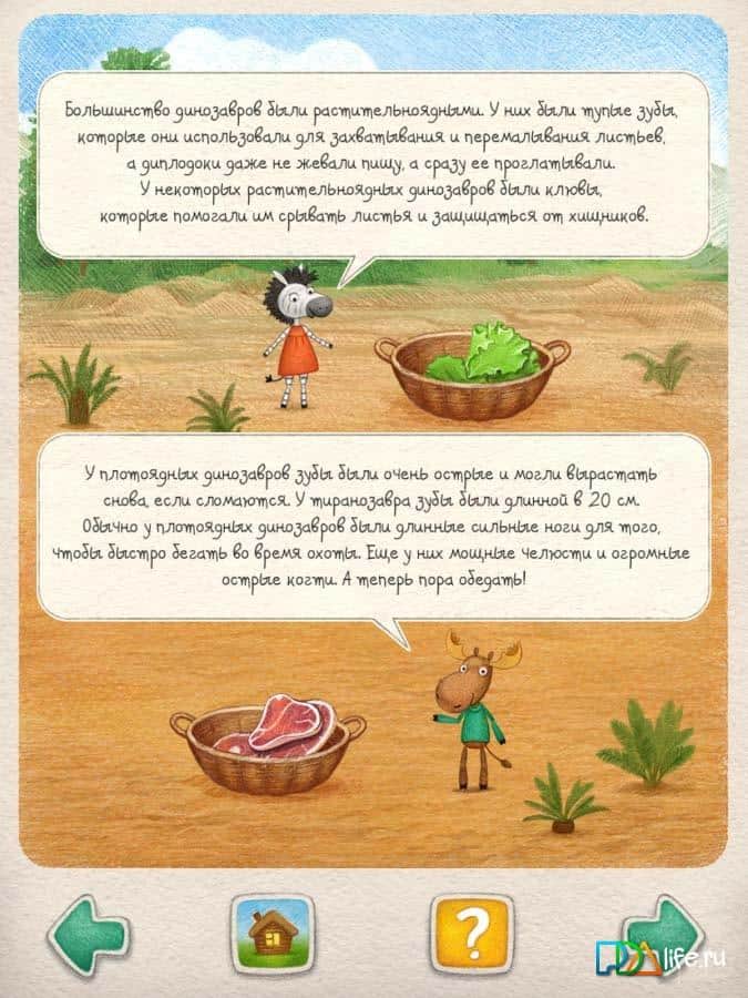 Лось и Зебра. Динозавры - отличный интерактивный познавательный журнал, который будет интересен не только детям, но и взрослым. Отправьтесь в увлекательное путешествие вместе с Лосем и Зеброй в эпоху динозавров, познакомьтесь с большим количеством видов ящериц, узнайте чем они питаются, значение их названий, отличительные признаки и многое другое. Выполняйте различные задания, которые будут направлены на развитие логики, математических способностей, внимания, памяти и моторики. Приложение содержит простой и понятный интерфейс.
