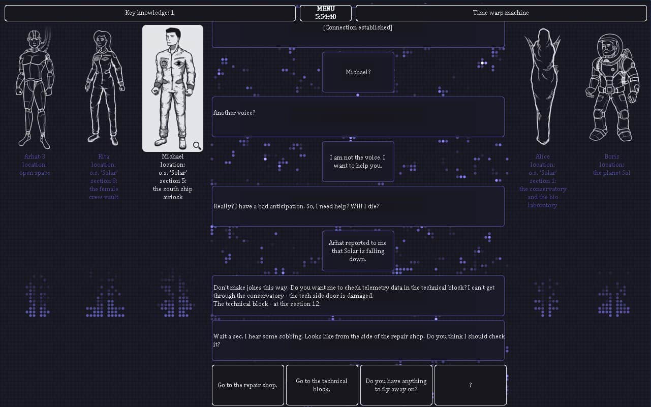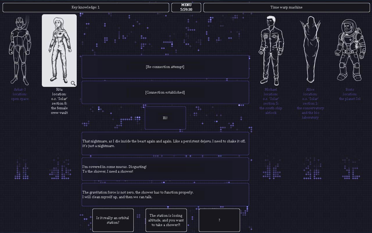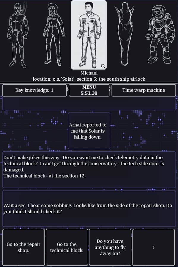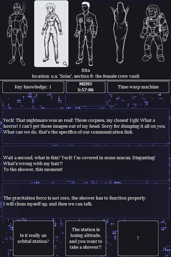 Lost Crew – интерактивный квест на андроид, где вам предстоит стать ключевой фигурой в спасении экипажа станции. Связь с орбитальной станцией была утеряна и вы единственный с кем они смогли связаться. Вашей задачей будет помочь пяти членам экипажа не дать погибнуть и за шесть часов с помощью различных команд разрешить их проблему. Вы сможете общаться со всеми героями игры, каждый из них поведает вам свою историю и покажет свой характер. Наши герои прошли не легкий путь, побывали в различных необычных местах огромной вселенной, не дайте им погибнуть, сгорев в атмосфере земли через шесть часов. Решайте непростые задачки и ведите диалоги со всей командой. Чем закончиться эта игра зависит только от вас игра имеет 32 варианта финалов от хороших до ужасных.