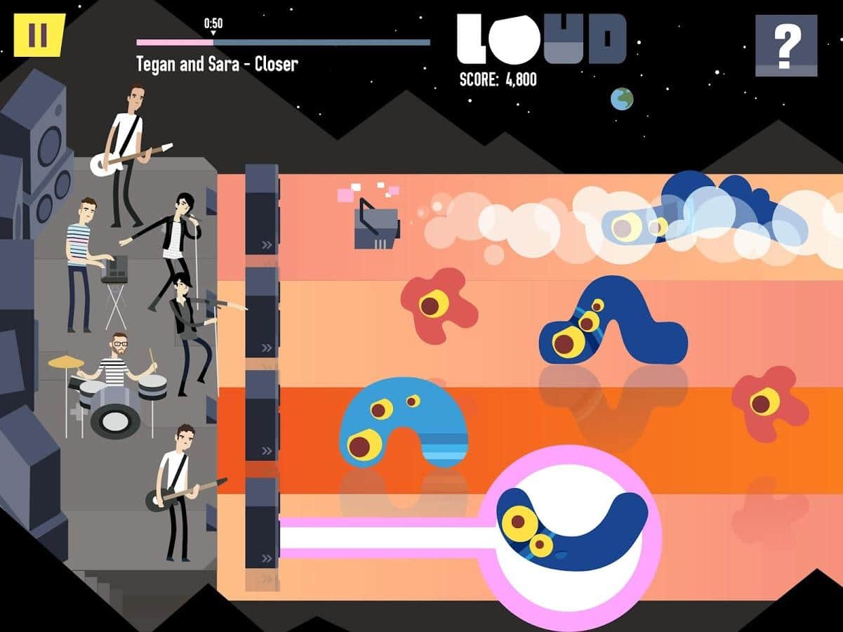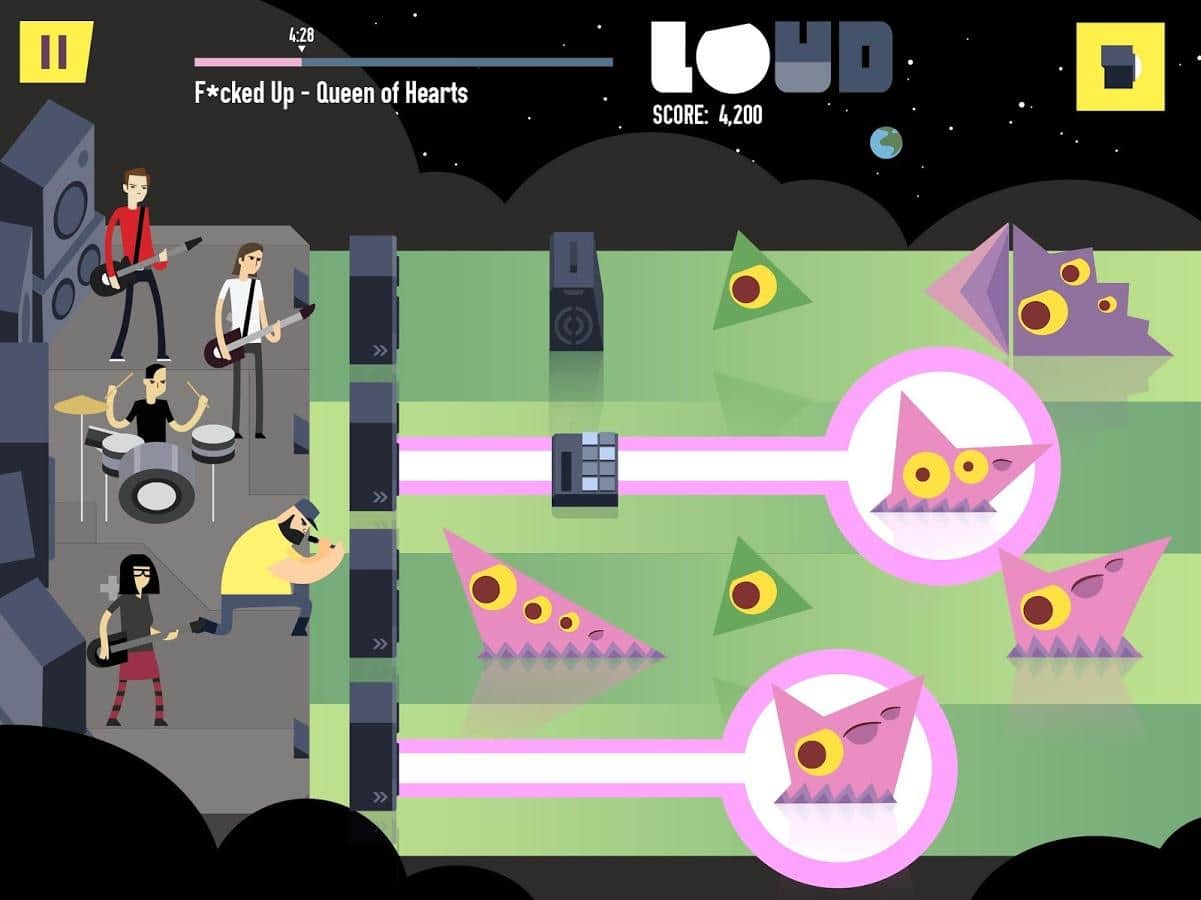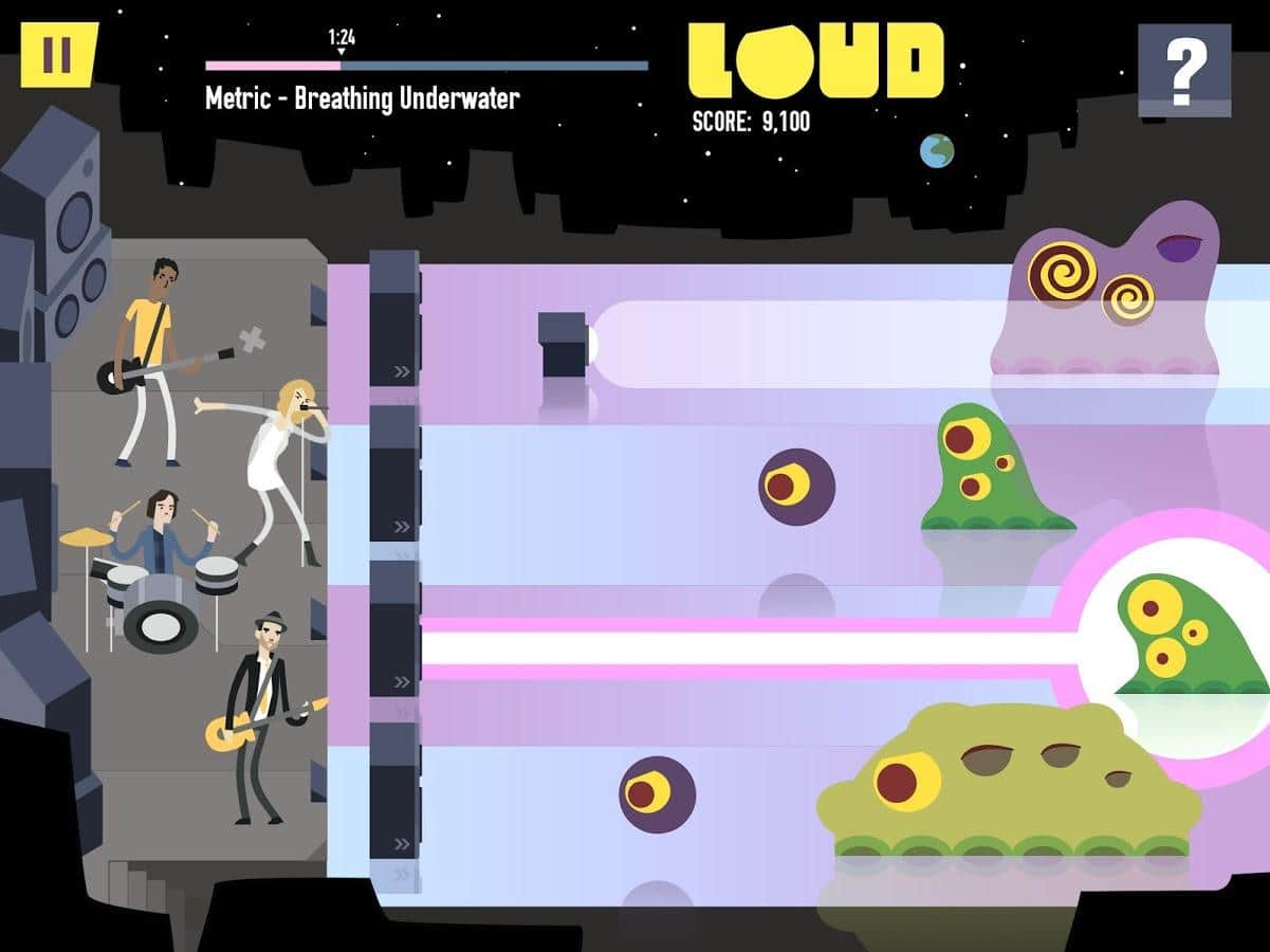 LOUD on Planet X – Увлекательная игра, в которой вам необходимо защитить играющих музыкантов от различной ползущей на них живности. В игре огромное количество музыки от таких групп как: Tegan and Sara, CHVRCHES, Lights, Metric, METZ, F*cked Up, HEALTH, Purity Ring, Little Dragon, Austra, Shad, Cadence Weapon, July Talk, Monomyth. На кажду группы в игре будет по 2 трека. Так что вы сами понимаете, что музыка в игре занимает одну из главных ролей. В борьбе против врага могут быть использованы все средства доступные для музыкантов: колонки, стробоскопы, генераторы тумана, усилители и даже вышибалы.