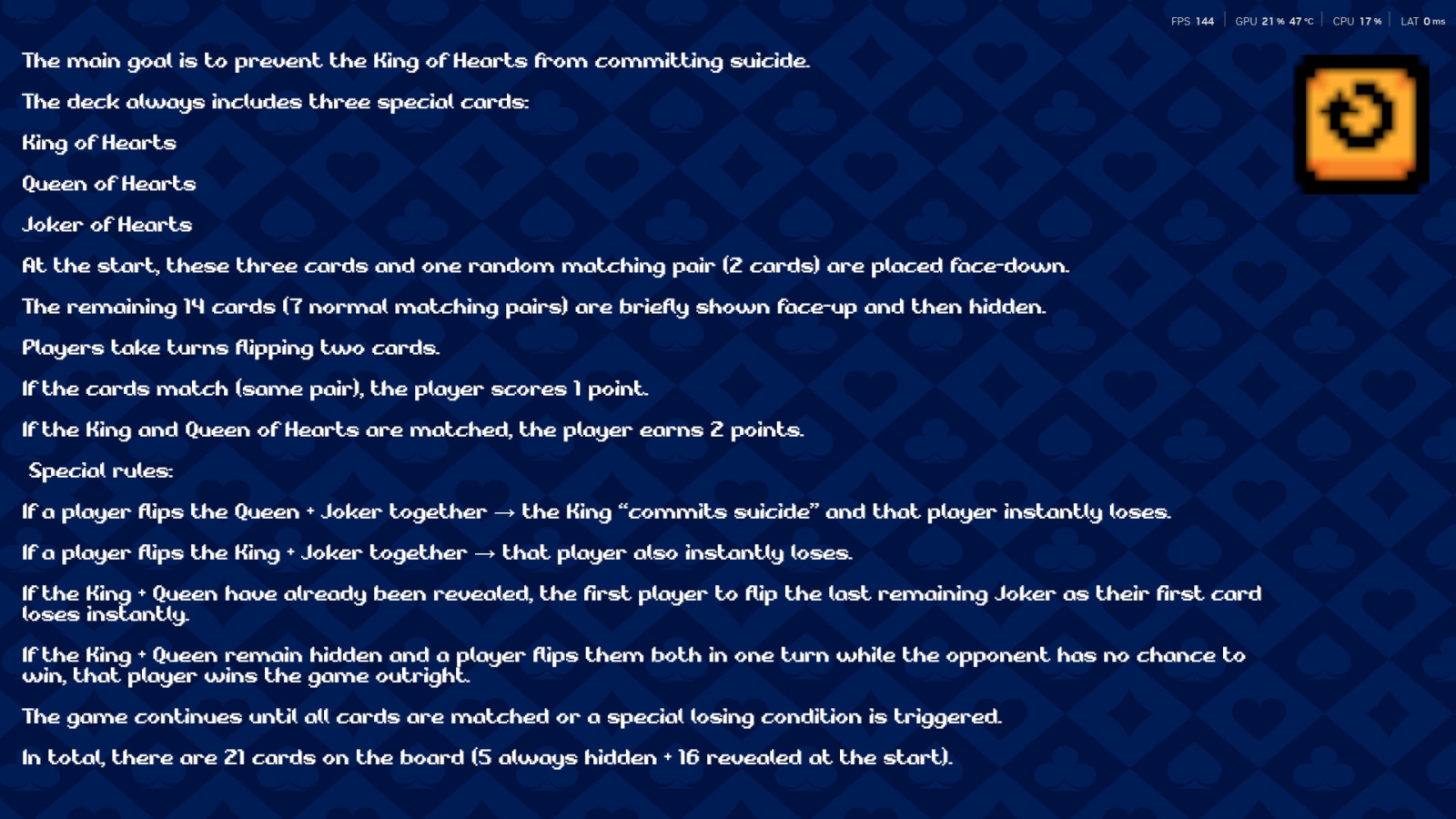 «Lover’s Memory» — это эмоциональное переосмысление классической игры «Мемори», где каждая перевернутая карта может стать решающей. Найдите пары, зарабатывайте очки и будьте осторожны со специальным трио — Король Чирв, Королева Чирв и Джокер способны полностью изменить ход партии. Быстрые матчи, простые правила и драматичные мгновенные победы или поражения делают игру напряжённой и увлекательной до самого конца.