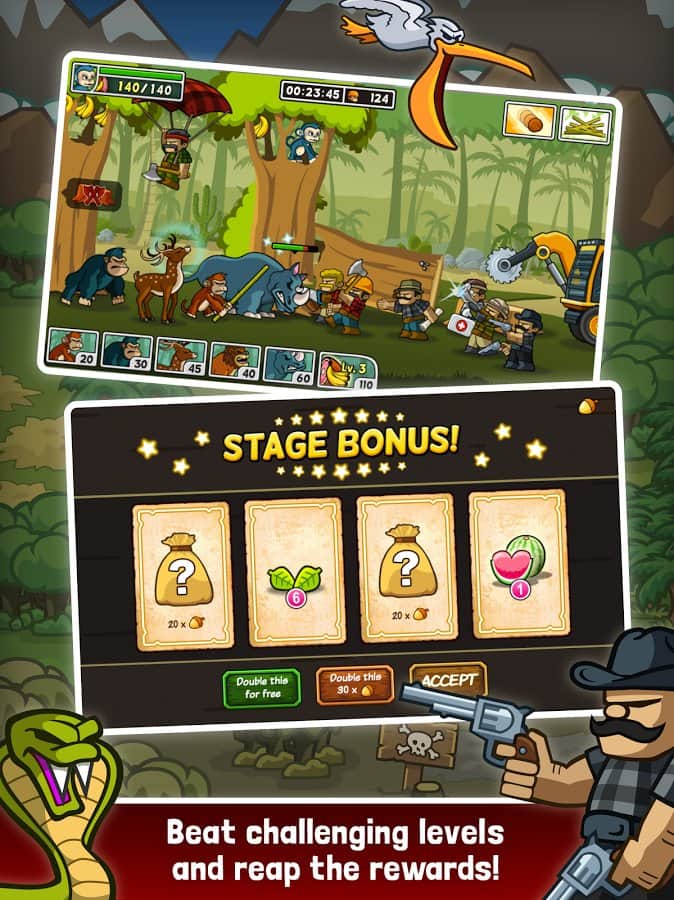 Lumberwhack: Defend the Wild - игра из серии оборона башен с элементами Touch Arcade. Подобное сочетание игровых жанров конечно же не позволяет отнести Lumberwhack: Defend the Wild к стратегиям, но в то же время заметно добавляет геймплею динамизма и азарта. Сюжет игры разворачивается в сердце Африканских джунглей, труднодоступных и непроходимых лесов, но даже туда добрались жадные и коварные лесорубы. Рубщики уничтожают леса просто гектарами от чего конечно же страдают животные. Но нашелся отважный герой по имени Коко Корнелиус, маленькая, но очень смелая обезьянка, которая подняла настоящую освободительную войну, объединив всех животных джунглей. Ваша задача помочь Коко Корнелиусу прогнать жадных лесорубов и вернуть джунгли себе. Вас ждет бескомпромиссное сражение на протяжении более чем 60 уровней, уникальные навыки и достижения персонажей и конечно же масса приключений.