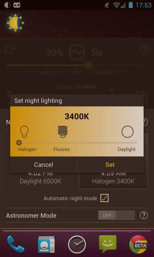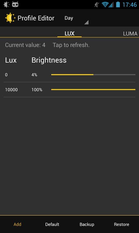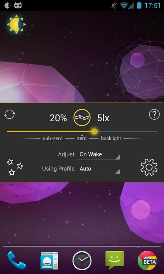 Lux Auto Brightness - Это не просто обычное осветительное приложение. Оно автоматически подстраивается под интенсивность освещения окружения, к примеру, если вы зайдете в слабо освещенную комнату, Lux автоматически понизит яркость вашего экрана, чтобы было не только удобно для глаз, но и в энергосберегательных целях. В опции Lux входят как автоматически фиксированная по времени смена яркости (периодический режим), так и смена яркости в зависимости от смены освещения окружения (динамический режим). Также вы с легкостью можете отключить эти опции и установить статическую яркость дисплея.