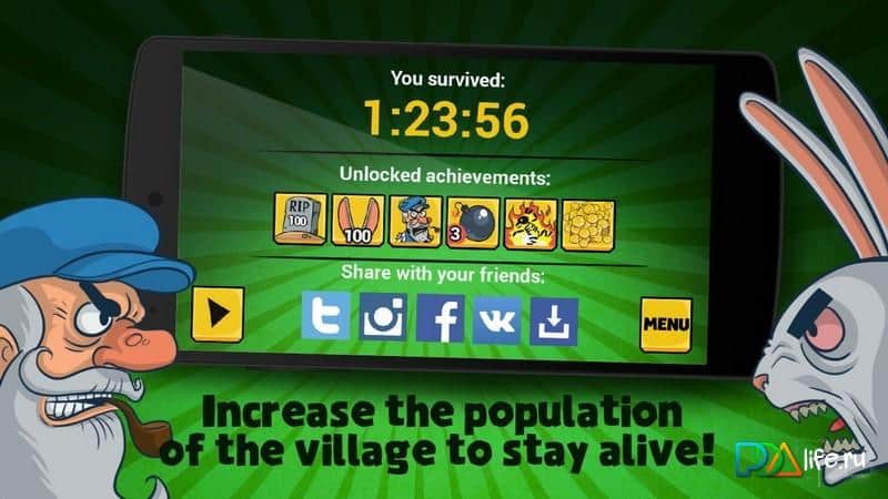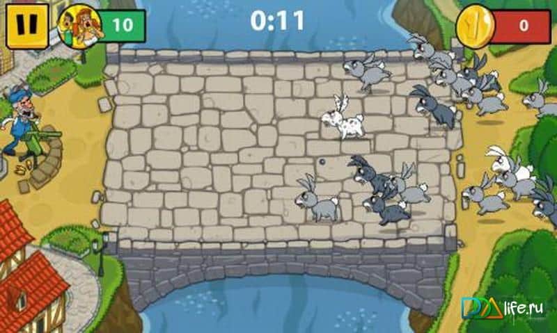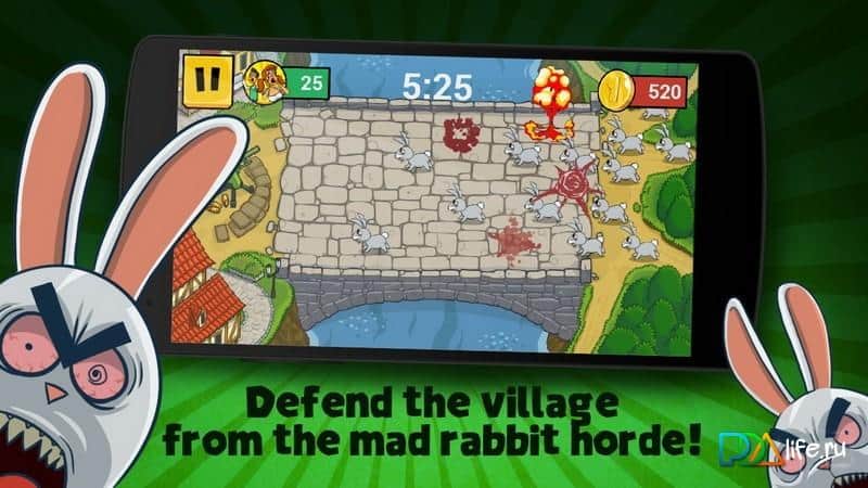 Безумные Кролики: Отстрел – не знаю даже каких грибов объелись лесные кролики, но ушастые возомнили, что они могут так просто выйти из лесу и отправится завоёвывать небольшой городишко. На пути к городу есть мостик, через который и идут толпы зайцев, но им путь преградил отважный престарелый защитник, возможно это дед Мазай решил исправить свою давнюю ошибку, а может просто зайчатинки захотелось отведать, но это уже не так-то и важно. Главное что у него внушительный арсенал для отстрела косых, и мы им непременно воспользуемся. Мочим зайцев, собираем монеты, прокачиваем оружие, опять мочим зайцев, едим пельмешки с дичью, опять прокачиваем пушку, шьём шапки и так пока ушастых полностью не перебьём.