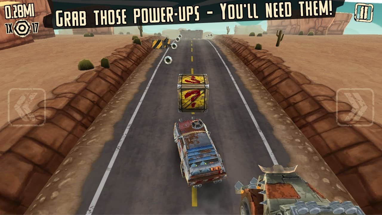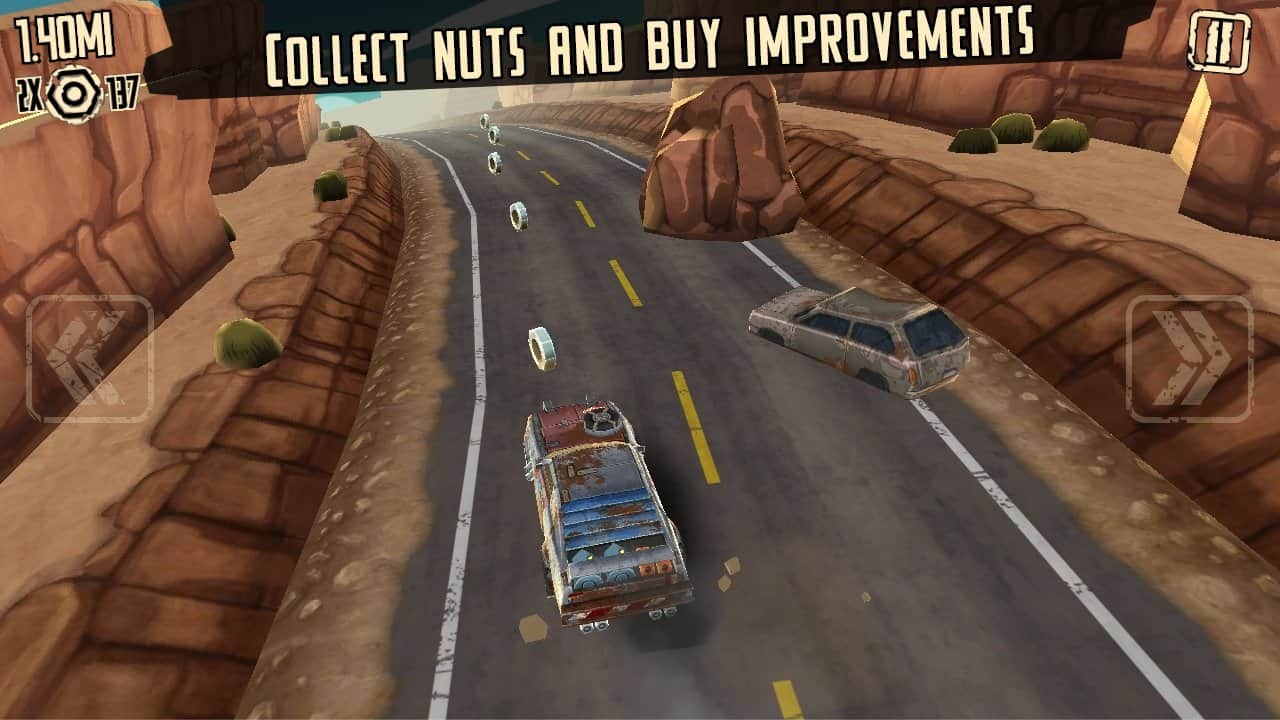 Mad Road Driver - сумасшедшие гонки на android, в которых вам предстоит ездить по разбитым дорогам уезжая от огромного грузовика, который пытается вас догнать. Гоните на огромной скорости, обходя все препятствия на своем пути, и старайтесь не попасть под колеса грузовику. На вашем пути то и дело будут попадаться гайки, которые необходимо собирать, чтобы получить дополнительные бонусы и оторваться от грузовика. Давите педаль газа в пол и побейте все рекорды по скорости в этой игре.