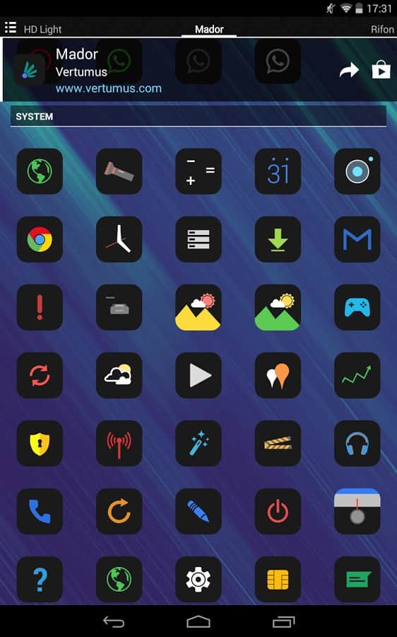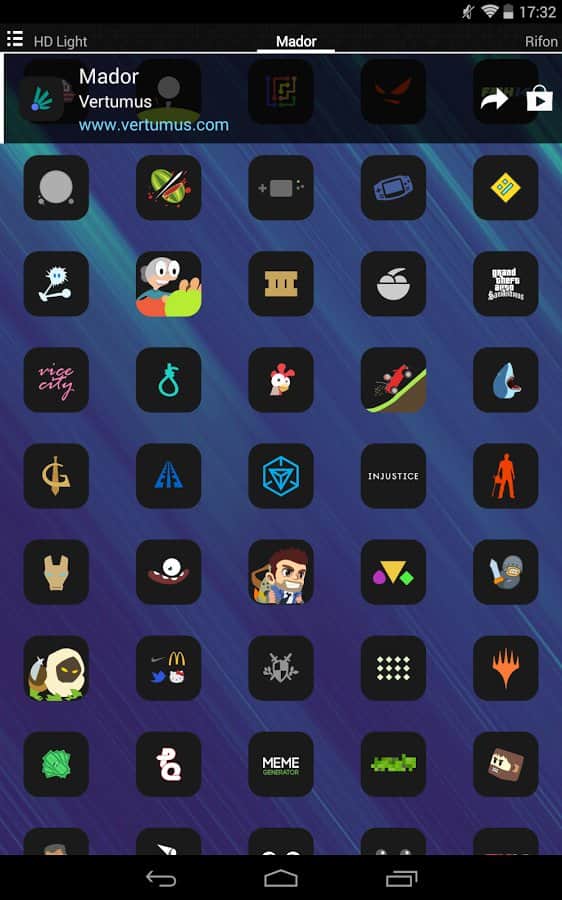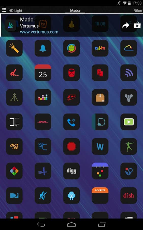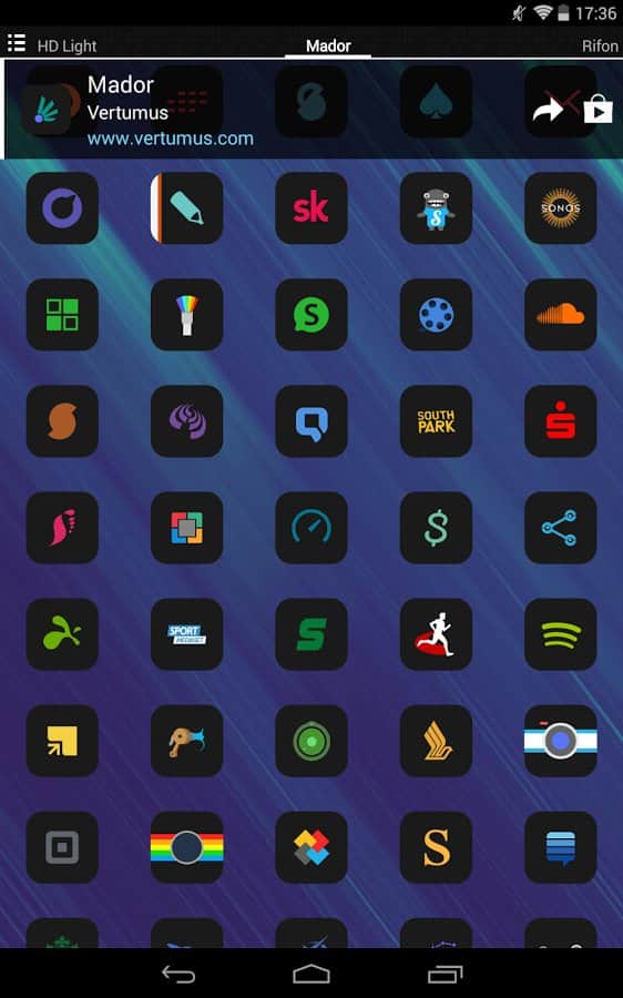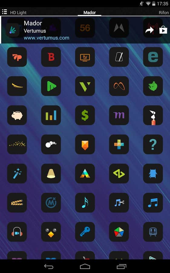 Mador - Icon Pack - это набор иконок содержащих в себе минималистичный дизайн но в тоже время сделаны весьма необычно и красиво. Данные иконки отлично подойдут тем кто предпочитает темные тона, ведь все они сделаны на черном фоне хотя и выглядят довольно ярко.