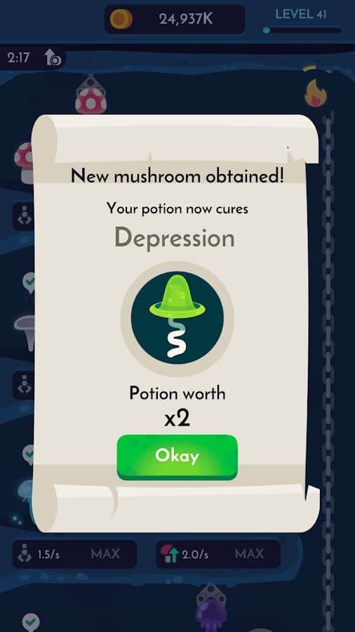 Magic Mushrooms – кликер на андроид, где вы будете создавать зелья. В игре вы сможете почувствовать себя алхимиком и превращать грибы в зелье для того чтобы вылечить весь мир. Выполняйте различные миссии и квесты ради благого дела и послужите на благо всего человечества. Станьте первым кто создаст зелье, которое исцелит все болезни и заработайте свои первые миллионы. Соединяйте одинаковые грибы и получайте совершенно новые виды, которые нужны вам для ингредиентов зелья. Собирайте все нужные вам ингредиенты и занимайтесь исследованиями.