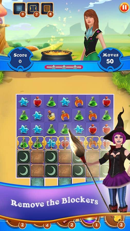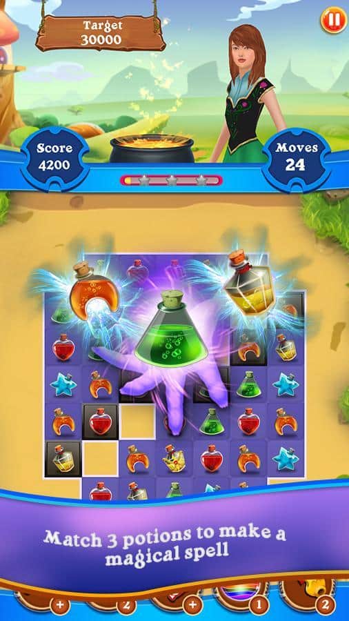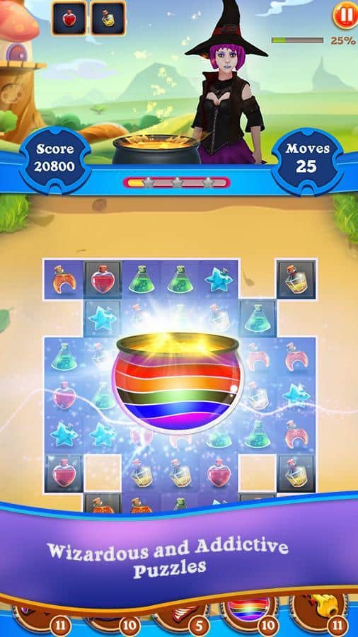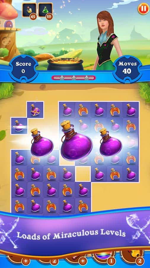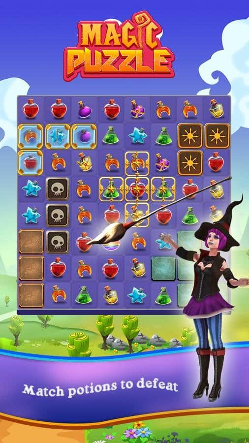 Magic Puzzle - Match 3 Game – головоломка на андроид, где вы будете помогать принцессе, победить злую ведьму. В этой игре вашей главной задачей будет составлять по три и более одинаковых зелья в ряд, и выполнять поставленные миссии. Путешествуйте по сказочной стране этой игры и применяйте все свои умения и знания, чтобы составить как можно длиннее ряды из бутылочек с зельем, чтобы победить злую ведьму. Применяйте магические заклинания и другие бонусы, чтобы быстрее закончить уровень и набрать максимальное количество очков. Запускайте в действие цепную реакцию и наслаждайтесь красивыми взрывами и красочными спецэффектам. Соревнуйтесь со своими друзьями за лучшие результаты и поднимитесь на самый верх таблицы лидеров.