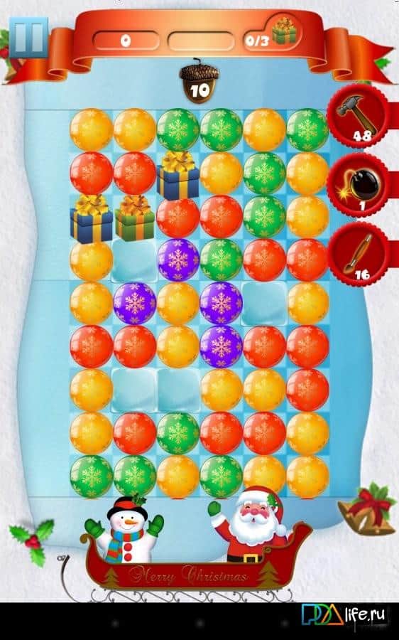 Волшебное Рождество - Новогодняя головломка на андроид в стиле три в ряд. Санта Клаус собирается в путешествия, в котором он будет раздавать подарки. Но их сначала нужно загрузить в волшебные сани. Цель игрока как раз и будет заключатся в том, что за определенное количество ходов, ему нужно погрузить все игрушки в сани.