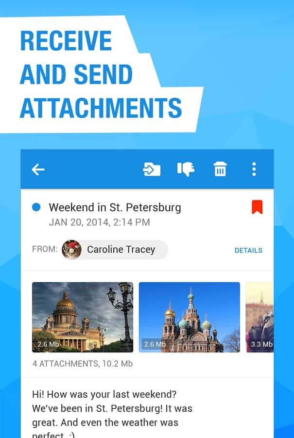 Mail.Ru - Email App - Официальное мобильное приложение от компании Mail.ru. Здесь вы сможете обмениваться письмами или же хранить свои переписки. Это обыкновенное почтовое приложение от одной из самых больших компаний на просторах СНГ. Однако вы сможете управлять не только почтой mail.ru но и другими почтовыми ящиками, такими как: Yandex, Rambler, Gmail, Yahoo и другие популярные почтовые сервисы. И всё это в одном удобном и простом приложении, от отечественного разработчика.