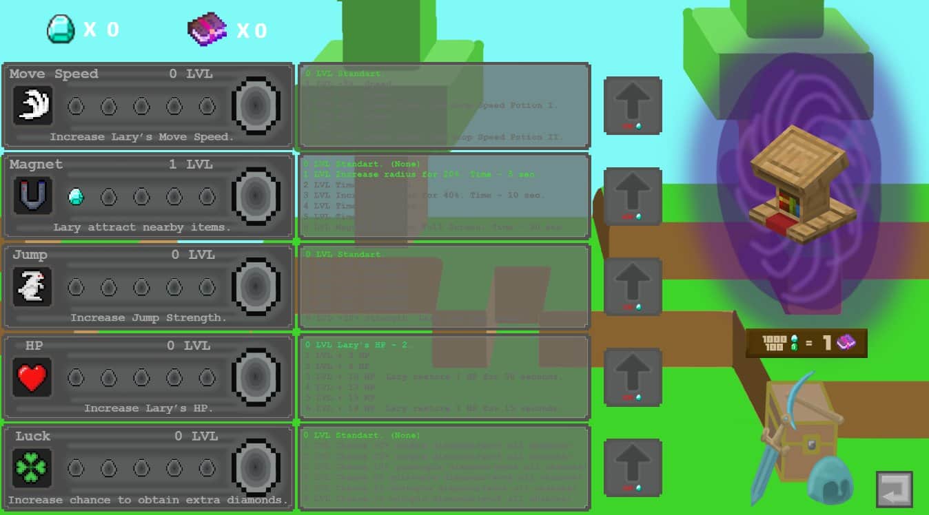 MainCroft Run! – это раннер с всевозможными квестами и приключениями. В этой игре вам предстоит вжиться в роль отважного рыцаря, которого зовут Лари. Это не обычный рыцарь, это наследник огромных сокровищ, которые находятся под защитой могущественных скелетов-лучников.Чтобы найти и отвоевать эти сундуки с драгоценностями, вам необходимо проходить уровень за уровнем, набираясь опыта. Полученный опыт вы сможете вкладывать в прокачку своего героя, а именно в его скилы такие, как: скорость передвижения, магнетизм, прыгучесть, количество здоровья и простая удача, которая всем пригодится.