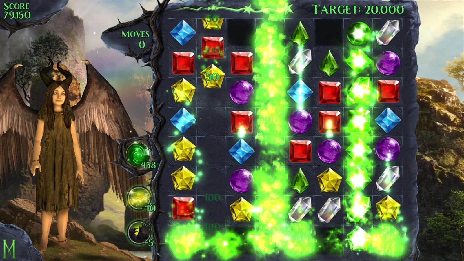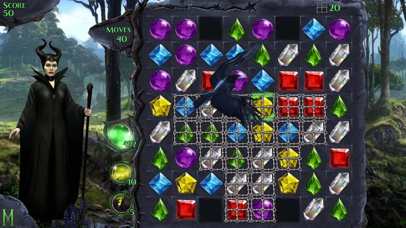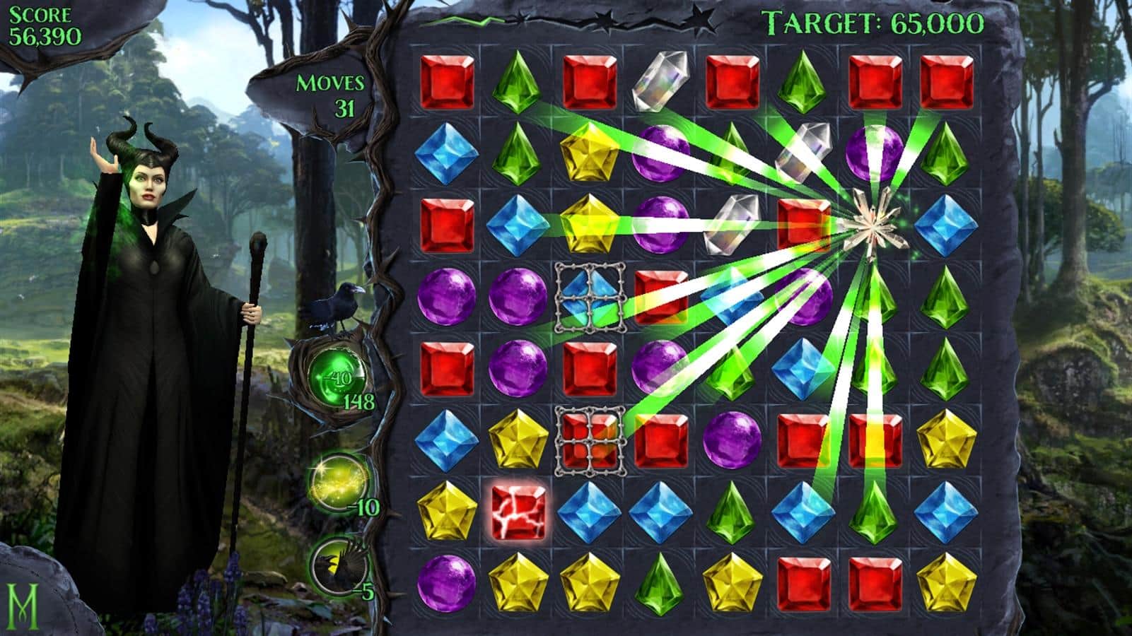 Малефисента. Звездопад - игра от студии Disney, которая дополняет замечательный одноимённый фильм. Игра представляет собой жанр «три в ряд», вам необходимо собрать в ряд три и более кристалла одинакового цвета и после этого они исчезнет. Игра подарит вам незабываемые приключения, полные тайн, загадок и ярких впечатлений. Играйте за молодую Малефисенту и наблюдайте как она постепенно превращается в злую ведьму. В игре много сюрпризов и бонусов, которые помогут вам пройти всю игру. Магия Малефисенты сможет разбить камни одинакового цвета.