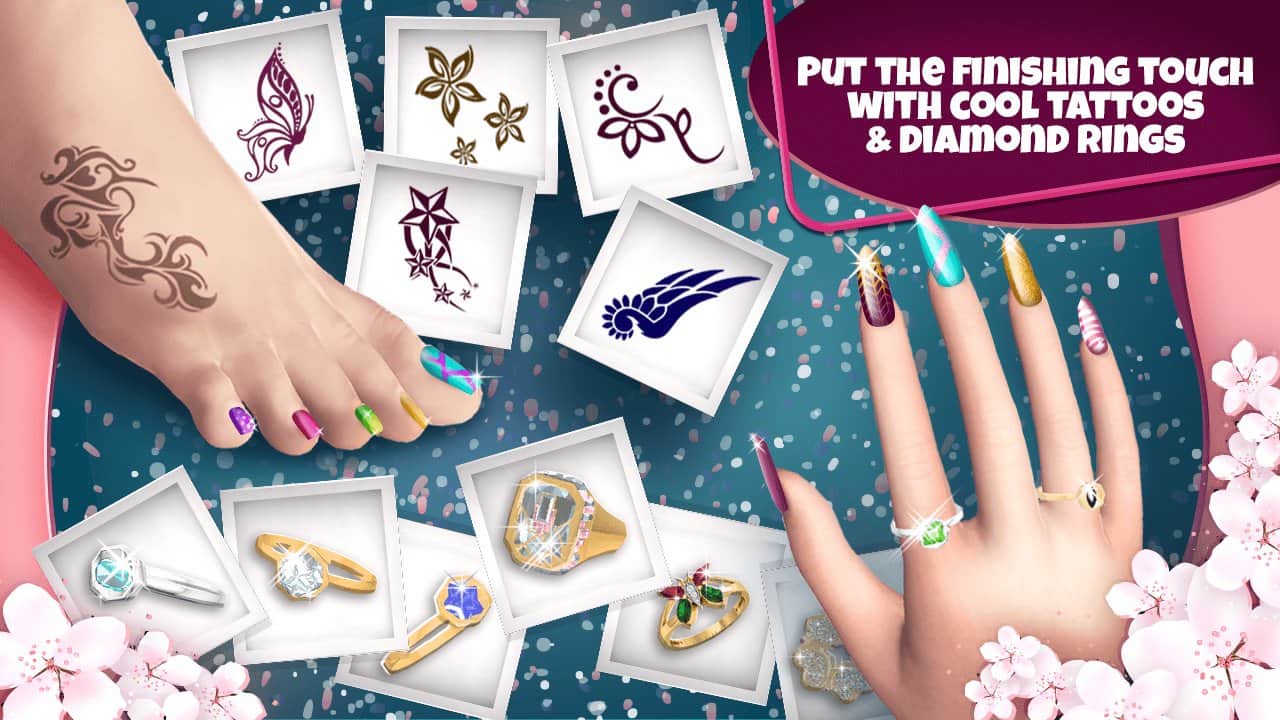 Manicure and Pedicure Games: Nail Art Designs – увлекательная игра для девочек где они будут выполнять маникюр. Все что необходимо девушке это иметь прекрасный маникюр и педикюр. Побывайте в салоне красоты и создайте там сказочный маникюр. Откройте для себя секрет совершенных ногтей и выбирайте из огромного разнообразия палитр лаков и сочетайте различные цвета между собой. Кроме всего этого вы сможете примерить на себя различные аксессуары в виде колец, наклеек и разнообразных татуировок. Играйте в эту игру в любое свободное время и экспериментируйте с покрытием и тонами лаков. Добавляйте на ногти различные рисунки и дизайны и весело проводите время.