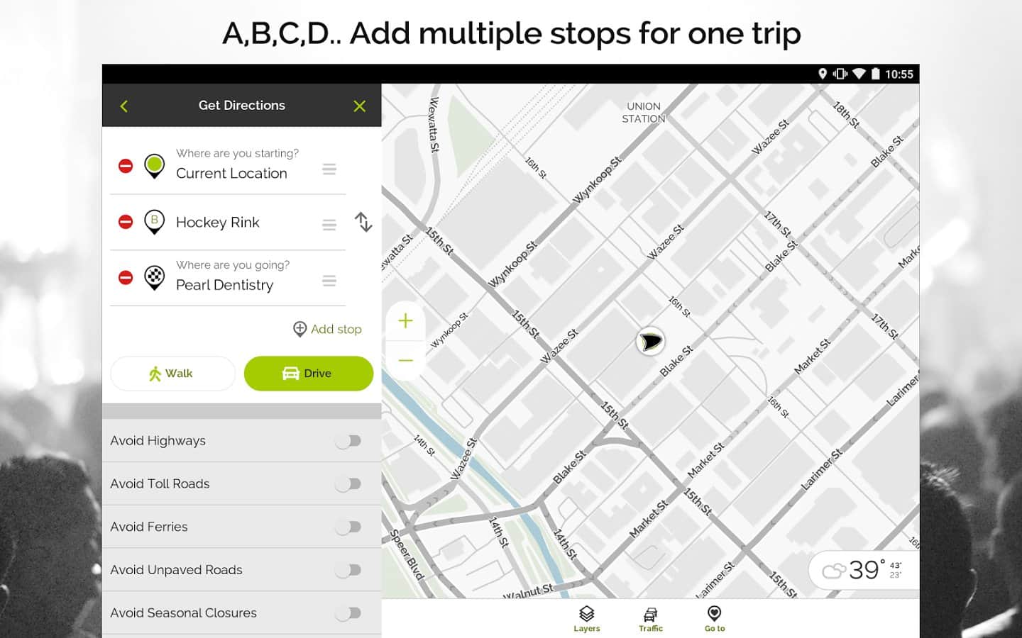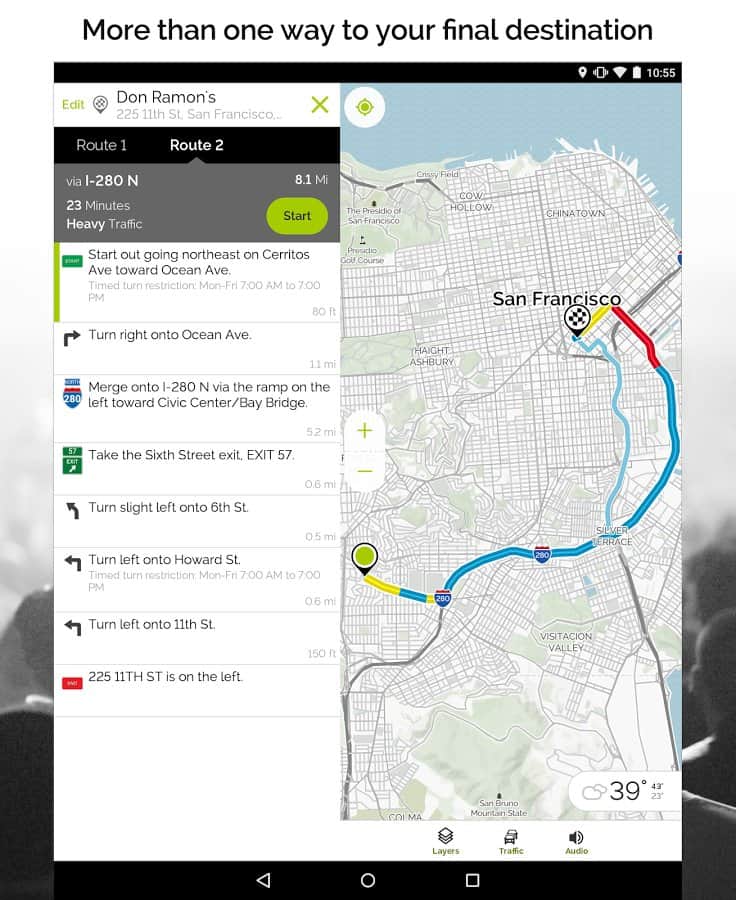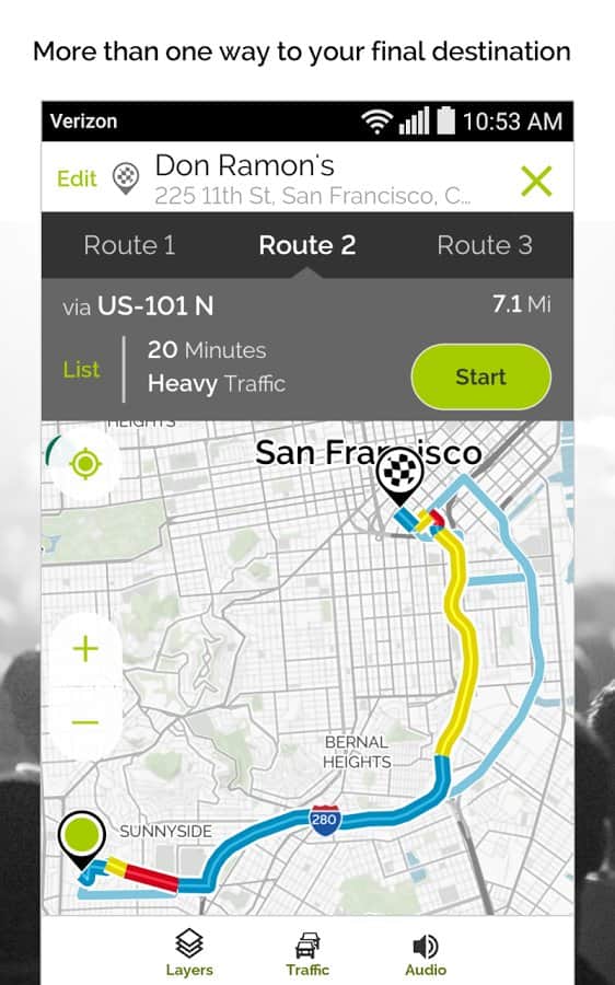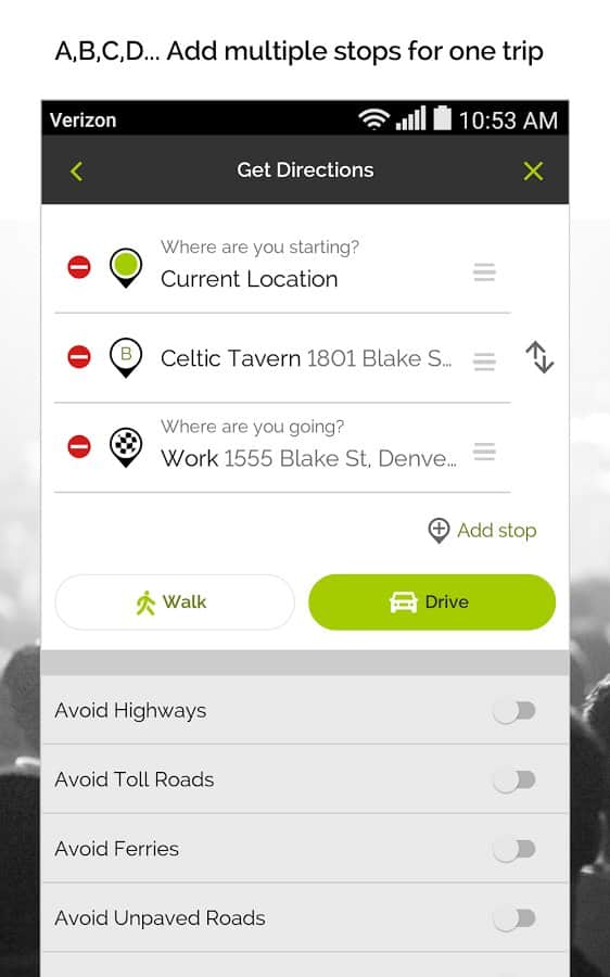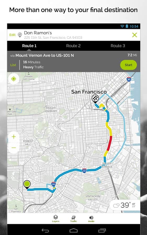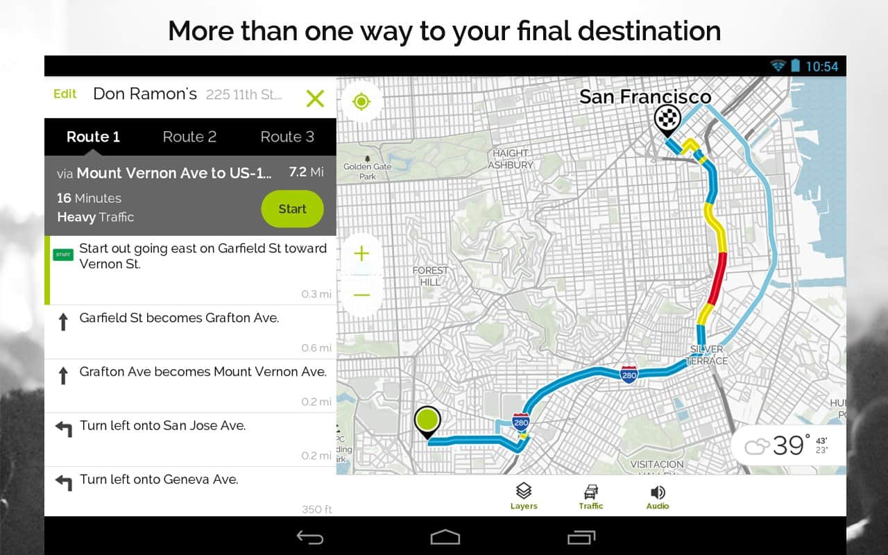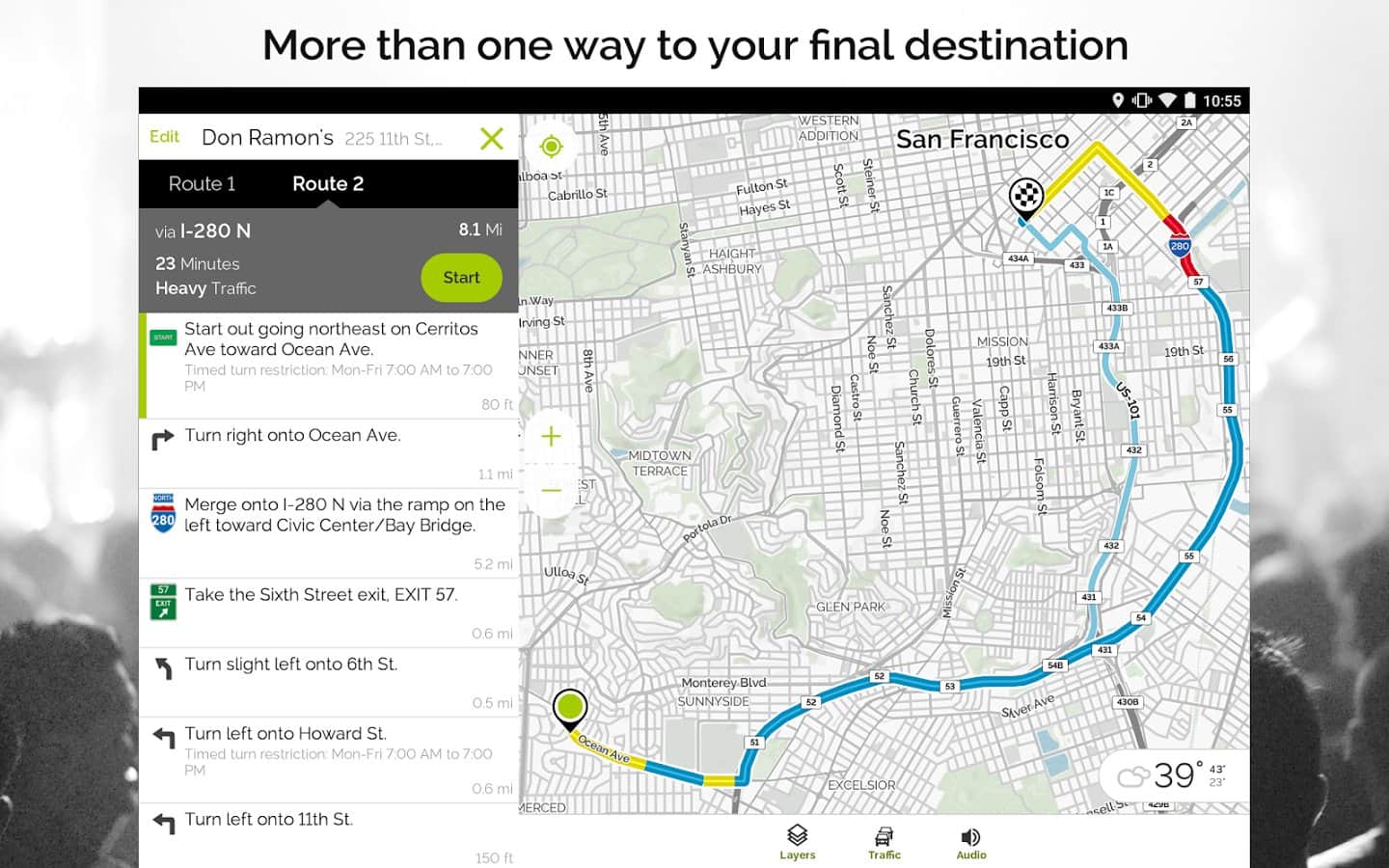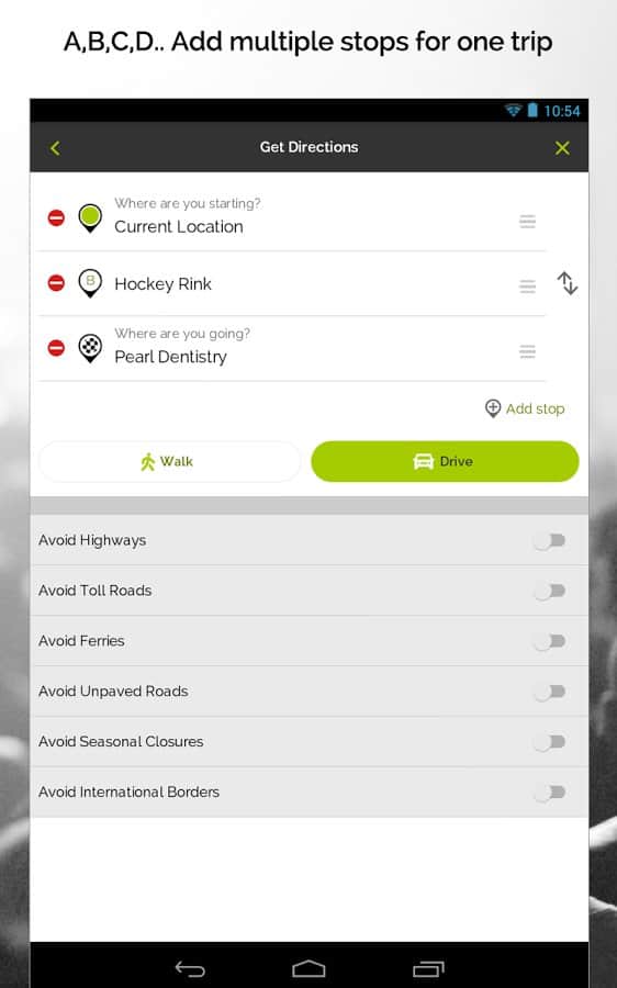 MapQuest – удобная навигационная программа для андроид, которая прекрасно работает с ОСМ и легко справляется с прокладыванием маршрута как внутри самой страны, так и между стран. Очень удобно добавлять нужные POI по пути следования к пункту назначения. Прекрасная настройка маршрутизации и маневренности включающая в себя такие моменты как: объезд платных дорог, шоссе, паромная переправа, грунтовая дорога, сезонно закрываемых, пересечения стран, а также, быстрый, короткий маршрут и пешеходный. Есть возможность управления голосом, правда пока только по-английски. А так же многое, многое другое. Хорошей поездки и незабываемых впечатлений!
