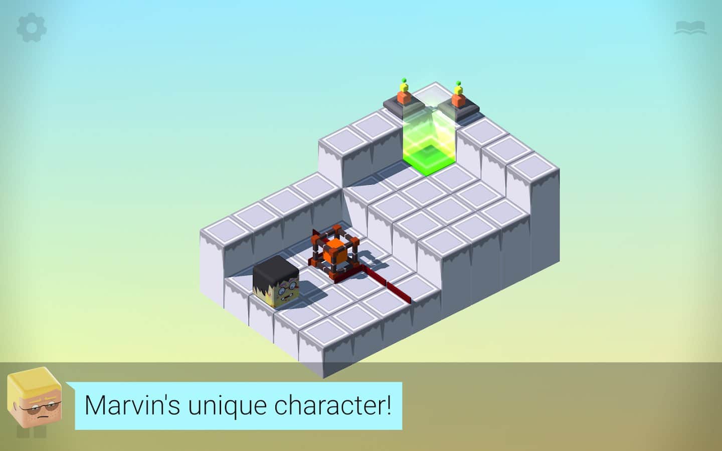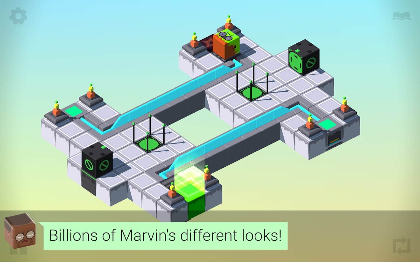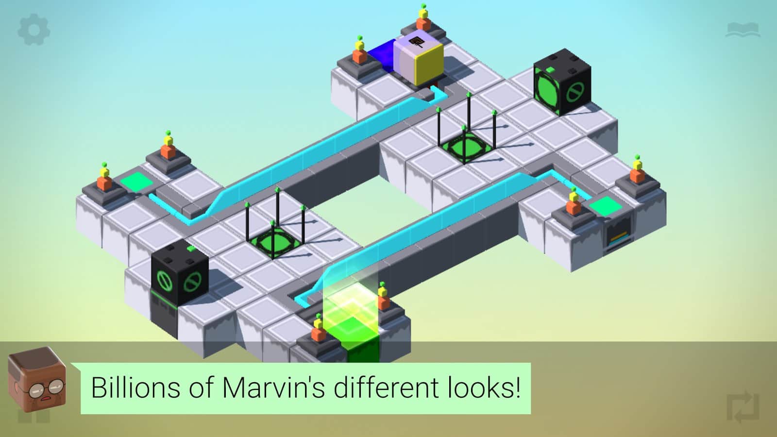 Marvin The Cube – увлекательная головоломка на андроид, где вы будете перемещать кубического героя по уровням игры. Наш герой Марвин решил открыть для себя совершенно новый мир и для этого, ему необходима ваша помощь. Перемещайтесь по запутанным лабиринтам и ищите выход из него, обходя многочисленные препятствия и преграды на пути. С помощью одного прикосновения пальца к экрану перемещайте героя по уровням и старайтесь избегать ловушек, а также взаимодействовать с различными объектами и используйте телепорты. Изменяйте внешний вид героя по своему усмотрению, делая его уникальным. Впереди вас ждут более 120 неповторимых уровней и увлекательный сюжет.