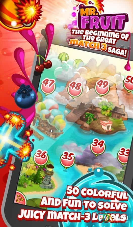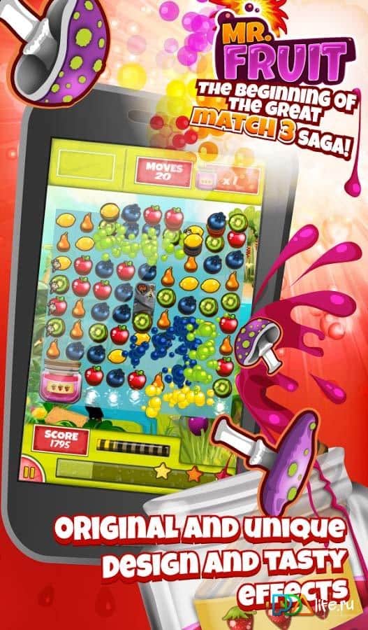 Match-3 - Mr. Fruit - Классическая андроид игра в стиле три в ряд. Только в этой игре вместо привычных всем кристаллов, использованы фрукты. На каждом уровне есть «закрашенные» кубики. Вам нужно с помощью комбинаций из одинаковых фруктов очистить поле от них. В игре использована очень красочная графика и очень увлекательный геймплей, тем самым поможет вам скоротать массу свободного времени.