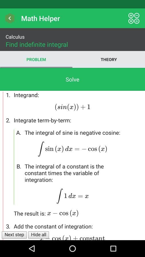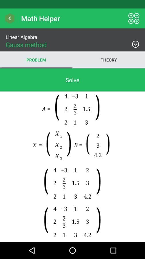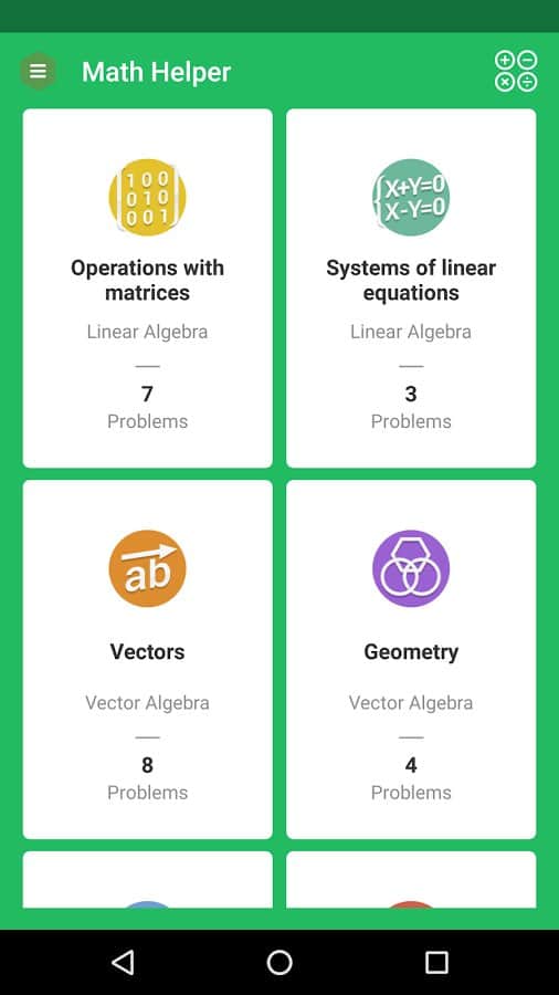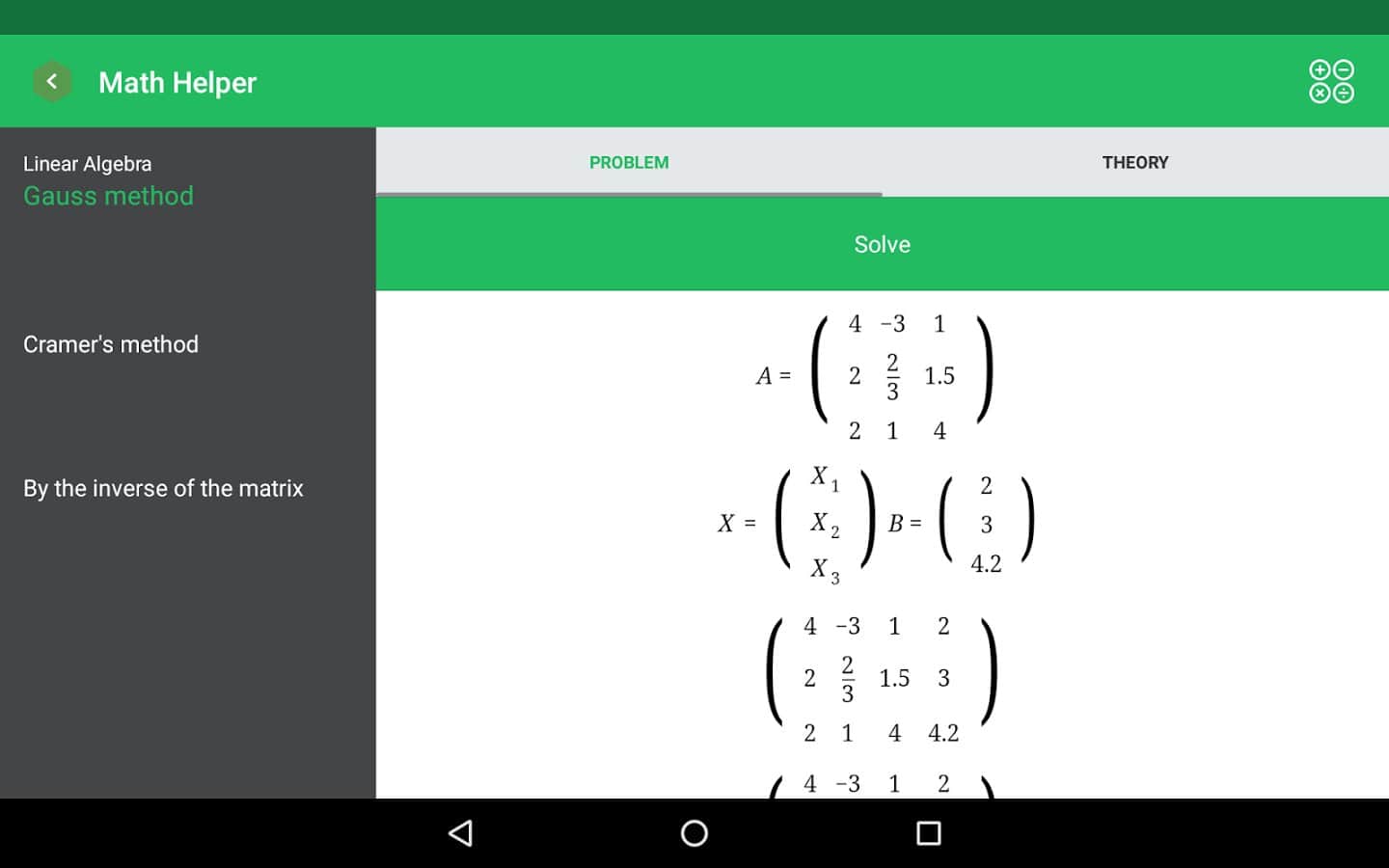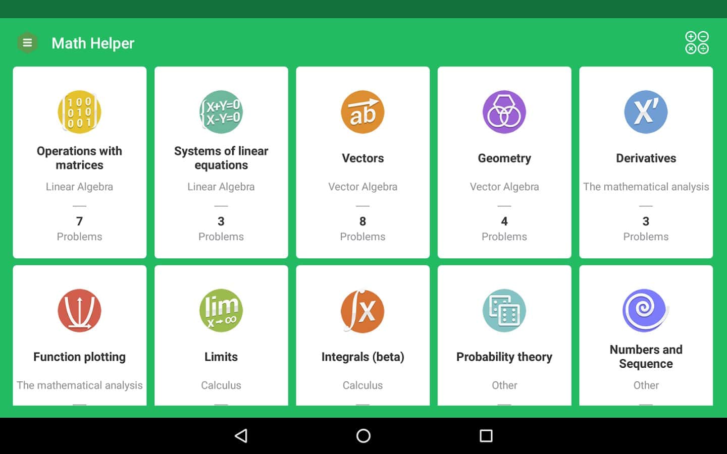 Математика от Алгебры до Вышки – замечательное приложение на андроид для школьников, студентов и не только, особенность которого заключается в отображении пошагового решения поставленной задачи. Понятный и доступный интерфейс делает приложение доступным абсолютно всем желающим. Решить контрольную работу, сдать экзамен теперь возможно без особых проблем, ведь "Математика от Алгебры до Вышки" запросто справиться с производными, геометрическими фигурами, задачами по статистике, матрицами, графиками функций, системами уравнений, векторами, математическим анализом, теорией вероятностей и многим другим.