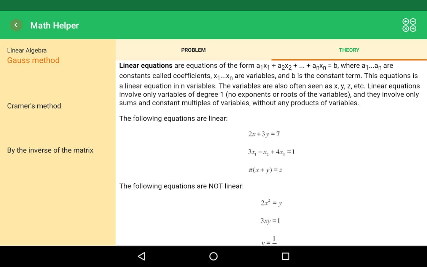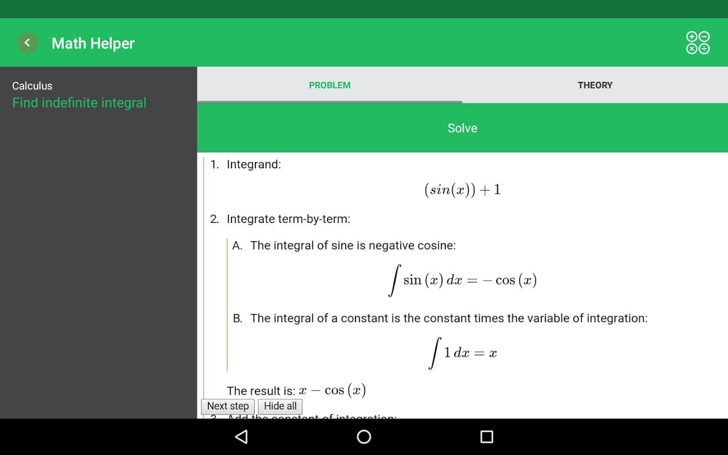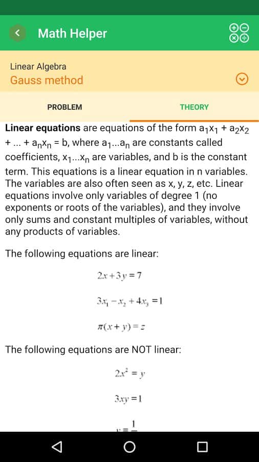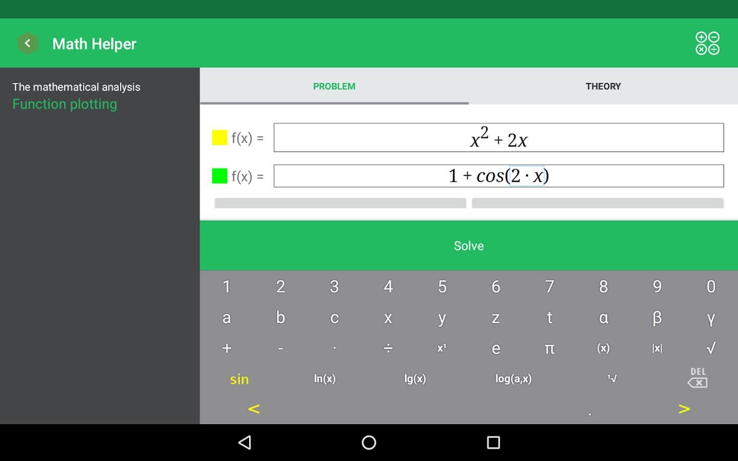 Математика от Алгебры до Вышки – замечательное приложение на андроид для школьников, студентов и не только, особенность которого заключается в отображении пошагового решения поставленной задачи. Понятный и доступный интерфейс делает приложение доступным абсолютно всем желающим. Решить контрольную работу, сдать экзамен теперь возможно без особых проблем, ведь "Математика от Алгебры до Вышки" запросто справиться с производными, геометрическими фигурами, задачами по статистике, матрицами, графиками функций, системами уравнений, векторами, математическим анализом, теорией вероятностей и многим другим.