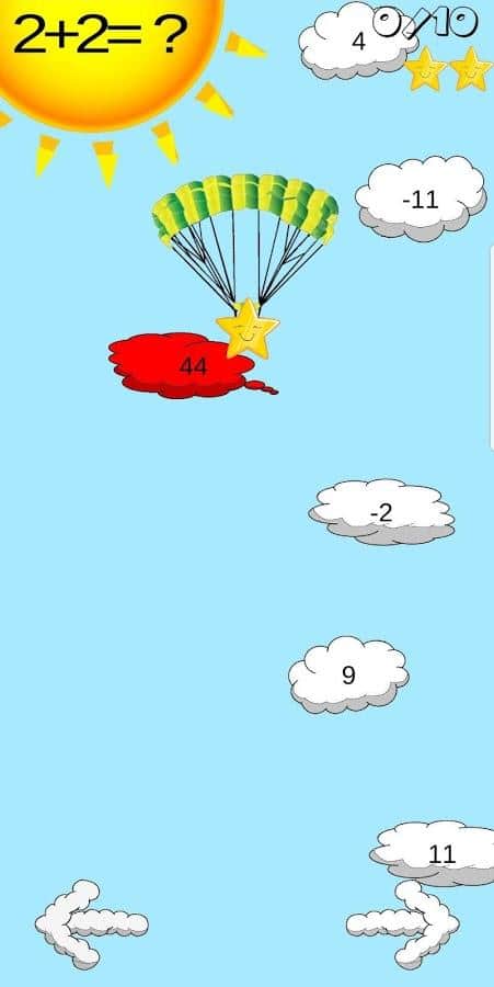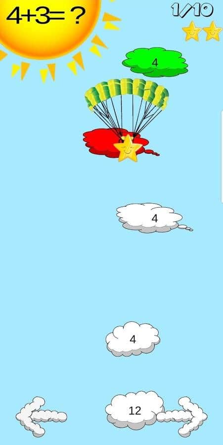 В приложении "Математика для детей" главный герой станет настоящим парашютистом и будет спускаться на землю, переходя от уровня к уровню путем решения примеров.