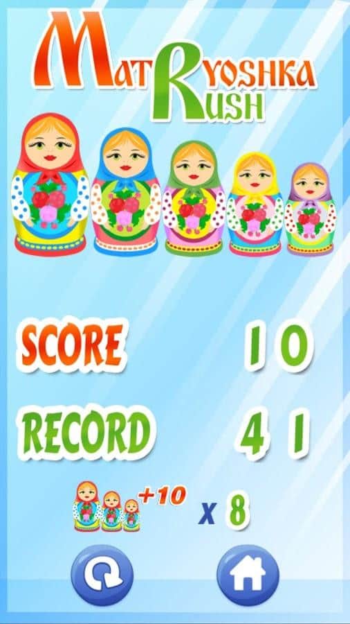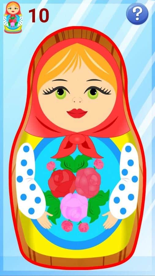 Matryoshka Rush – увлекательная игра на андроид, где вы будете создавать матрешки. В книгу Гиннесса была занесена матрешка, которая вмещала в себя 50 матрешек. Вашей задачей в этой игре будет создавать матрешки разных размеров и таким образом побить рекорд. Создавайте многочисленные и разнообразные матрешки и старайтесь при их создании не пересекать красную границу. Вмещайте как можно больше матрешек в одну матрешку и проходите все испытания игры стараясь подняться как можно выше в таблице лидеров. Соревнуйтесь с друзьями и добивайтесь отличных результатов.