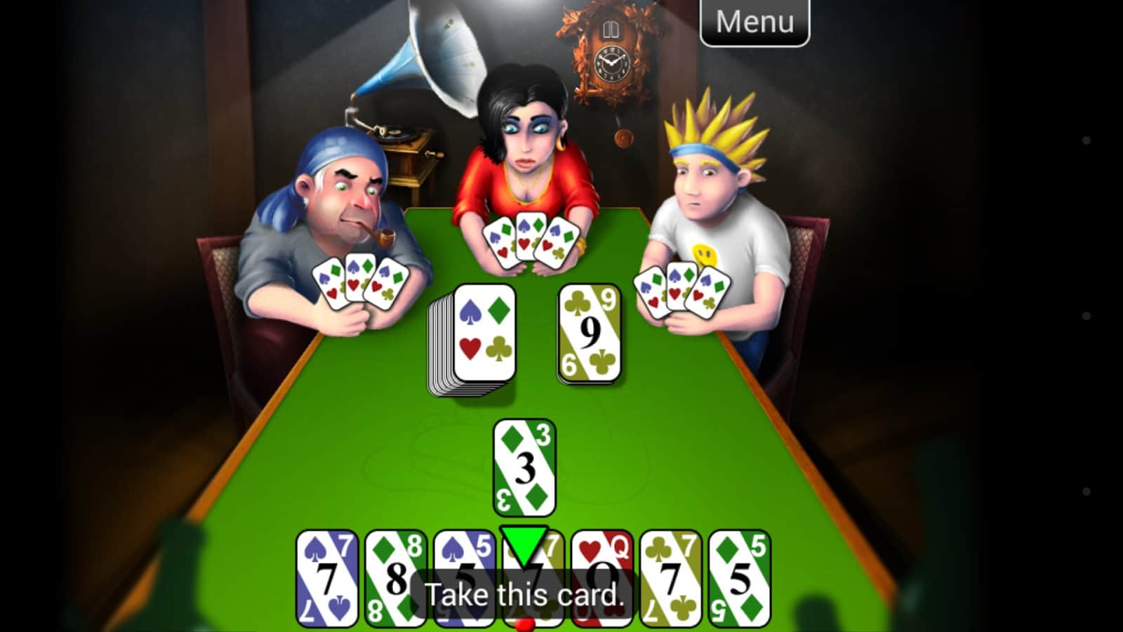 Mau Mau – классическая карточная игра на андроид, с возможностью играть с тремя игроками одновременно. В этой игре вы будете играть против компьютерных противников карты которых вы не будете видеть. В меню этой игры вы сможете выбрать против скольких игроков вы будете играть, и какие они должны быть. Вашей главной задачей будет вовремя скинуть все карты. В начале игры всем игрокам выдается по семь карт, карты кладутся в зависимости от масти и берутся из колоды. Для того чтобы обхитрить соперников вам предстоит приложить все свое логическое мышление и первым избавиться от всех карт.