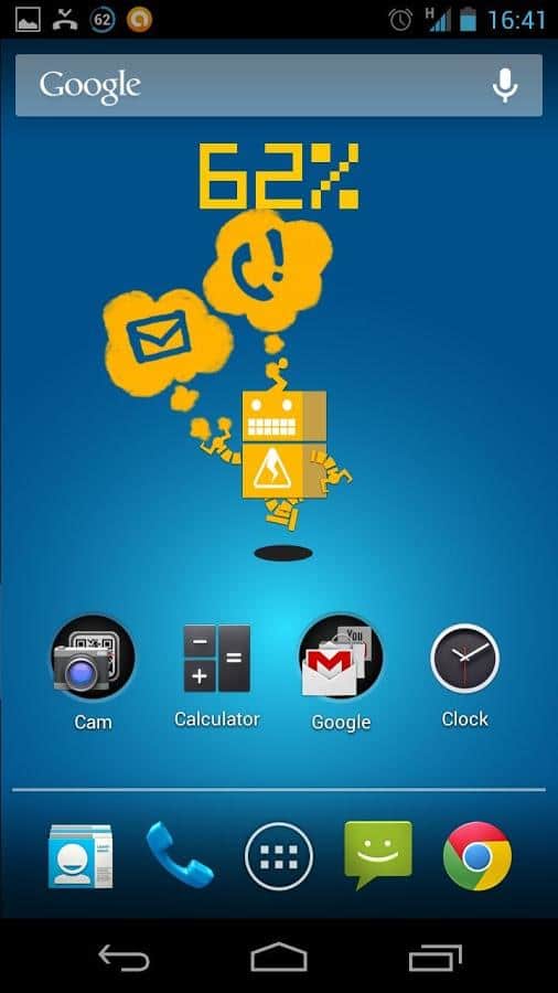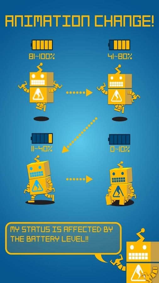 Mechanic T the Battery Runner - это приложение порадует вас своей веселостью и яркостью. На вашем экране бегает робот с анимацией и сигнализирует о заряде батареи. Кроме индикатора заряда можно настроить уведомление о сообщениях, звонках и пр. Ну и конечно же фон, анимацию и прочие настройки можно выбрать на свой вкус и цвет!