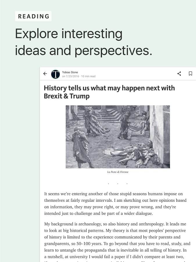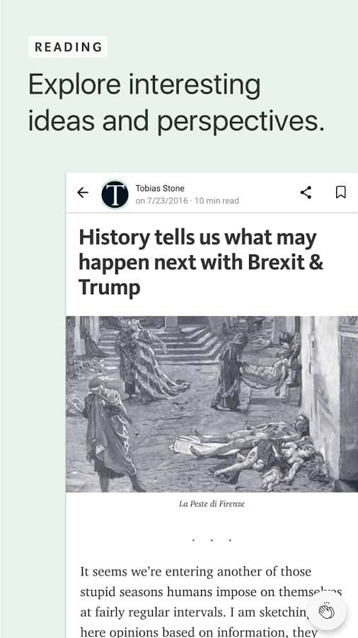 Medium — довольно интересная, хоть и не очень известная в наших широтах блог-платформа. В первую очередь, она заточена на создание пространных текстов или, как они названы в самом Медиуме, историй. Если вы уже имеете блог на данной платформе или только собираетесь его завести, вам стоит обратить внимание на фирменное приложение для Android. Оно позволяет читать блоги интересующей вас тематики, создавать собственные тексты, причем делать это здесь довольно просто, благодаря внятному интуитивному интерфейсу.