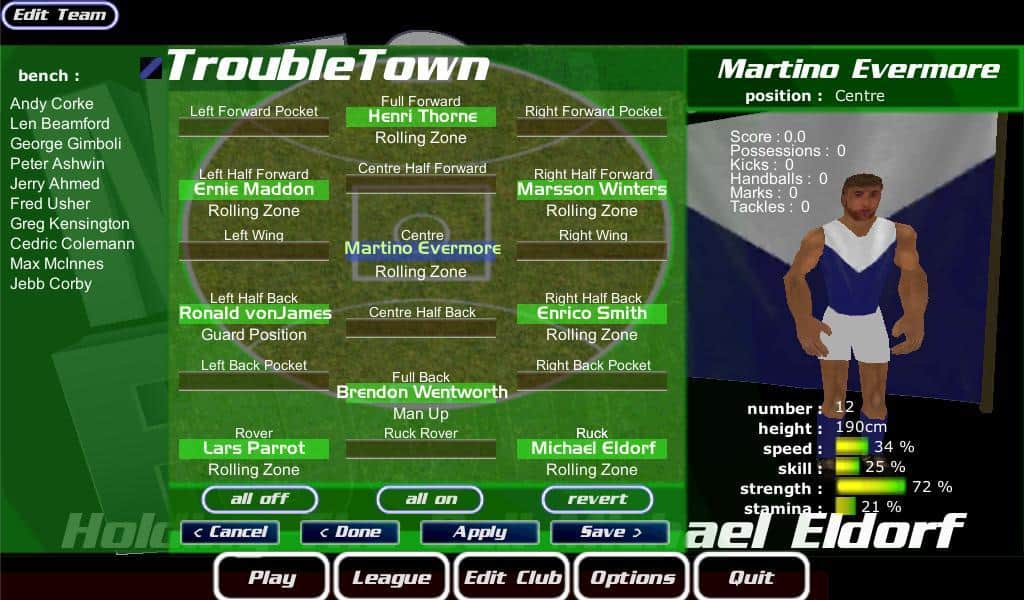 MegaFooty Quick Kick - спортивная игра рекби на андроид, где вы будете бороться с другими командами за кубок чемпиона. Вы будете играть в лигах AFL, VFL, SANFL и Wafl в Австралии, где вам предстоит управлять командой из 18 игроков. Эта игра потребует от вас быстрой реакции, чтобы поддержать стремительный темп игры, а также мастерское владение мячом. Игра порадует вас легким управлением и хорошей 3D графикой.