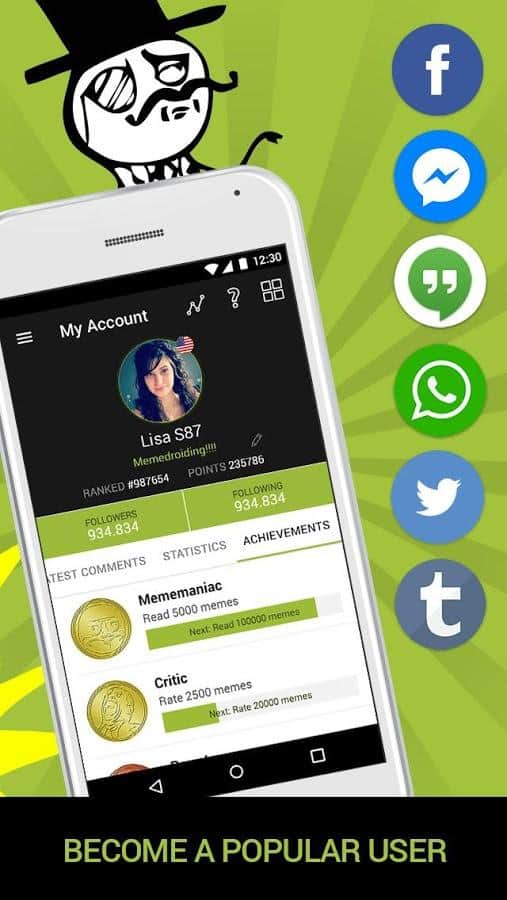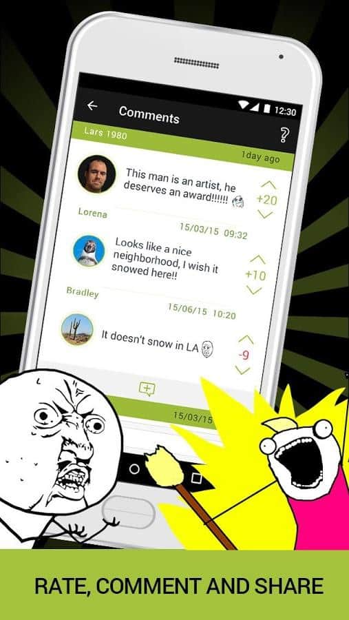 Memedroid Pro: Funny memes - Это не просто приложение с картинками, а настоящее онлайн сообщество любителей мемов и веселых картинок. Да здесь можно и даже нужно смотреть различные мемы, собранные в интернете, или же созданные пользователями этого приложения. Если у вас неожиданно возникнет нужда поговорить про мемы, то огромное сообщество в ту же минуту поддержит вас. Так же вы сможете создавать мемы сами, используя встроенный редактор.