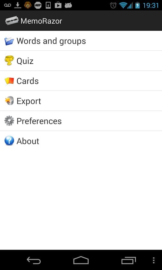 MemoRazor – отличное приложение с открытым исходным кодом на андроид для тех, кто хочет изучать иностранные языки (русский, английский, испанский, немецкий, французский, итальянский, польский, голландский) в удобной форме, времени и месте. Изучение происходит по группам слов, с помощью карточек и викторин! Развивайтесь вместе с MemoRazor.