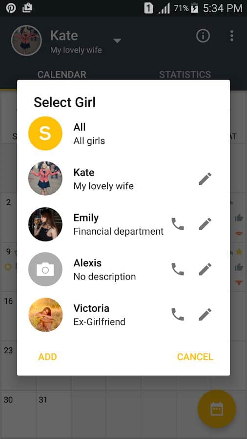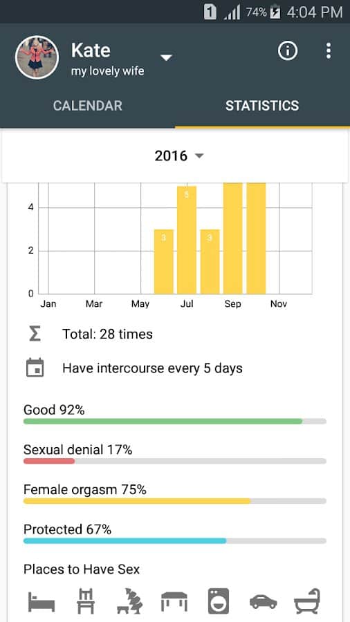 Большинство парней или мужчин и не догадываются, что существуют не только женские календари, но и мужские. Это приложение - спасение половой жизни мужского пола. Вводите имена и номера своих партнерш, указывайте когда у них начинаются и заканчиваются месячные, а потом узнавайте о следующих наперед, отмечайте когда у вас происходит секс в мельчайших деталях (место, время, безопасность, вид, оргазм), защищайте всех девушек разными паролями, ставьте в цели попробовать новые позы или необычные места. Ваша сексуальная жизнь теперь будет не просто понятной, но и поводом для гордости.