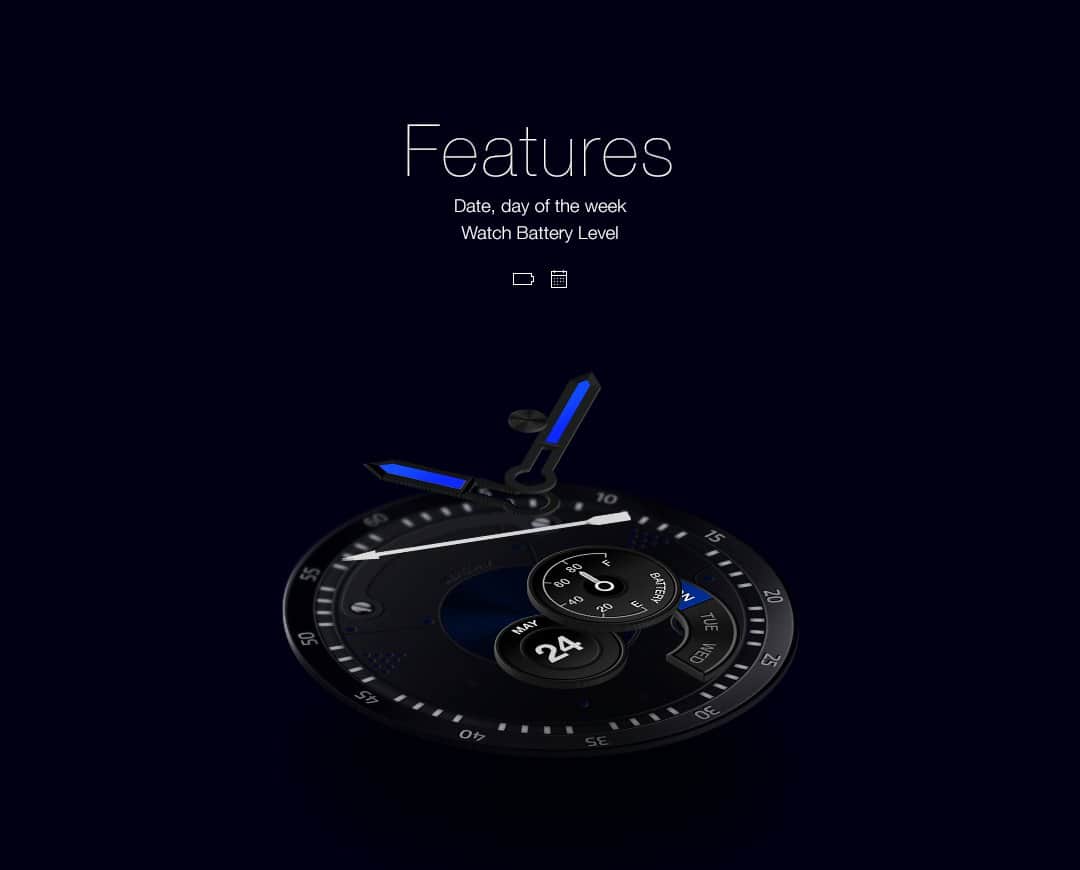 Кто-то в часах любит минимализм, некоторым подавай побольше стрелочек и датчиков. Представленные здесь часы — как раз для последних: стильное серо-синее оформление, включающее массу декоративных деталей, сочетается здесь с хорошей функциональностью. На циферблате успешно располагаются число, месяц, день недели, уровень заряда батареи и, если необходимо, индикация зарядки. Данный циферблат одинаково хорошо адаптирован и для круглых, и для квадратных экранов. Имеется и упрощенный режим для энергосбережения, при котором на экран будем выводится минимальный набор необходимой информации — только текущее время в понравившемся вам формате.