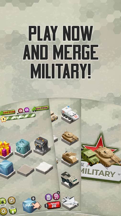 Merge Military Vehicles Tycoon - Idle Clicker Game – увлекательная игра на андроид, которая отлично подойдет для любителей военной техники. Соберите свой огромный флот и подготовьтесь к войне. На игровом поле появятся военные машины, грузовики, танки, самолеты и автомобили и вашей задачей будет находить одинаковые и объединять их получая совершенно новые виды. Играйте в эту игру в любое свободное время и весело проводите его. Погрузитесь в военный мир и станьте генералом который управляет военно-морским флотом, наземными транспортными средствами и воздушным флотом.
