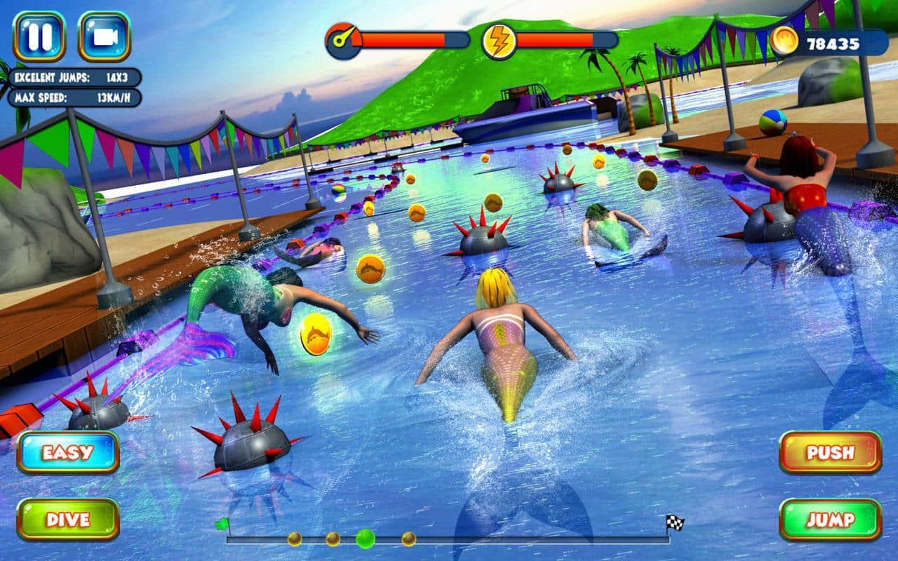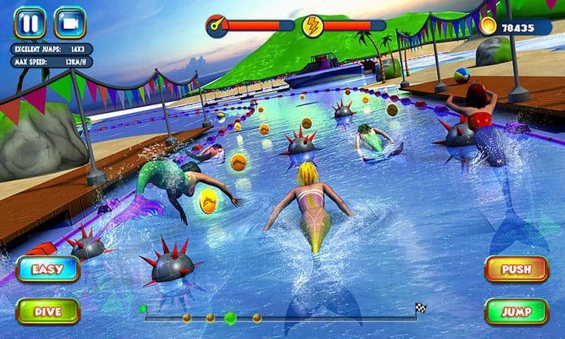 Mermaid Race 2016 – возьмите под свой контроль мифических русалок и проведите их по сложным трассам игры. В этой игре вы примите свое участие в соревнованиях русалок, плавая по сложным трассам и обходя многочисленные преграды на пути. Управляйте движением русалок и помогайте им дойти до финиша и обойти все преграды на пути. Касайтесь экрана в нужный момент и прыгайте через кольца, проплывайте под шипами и перемещайтесь из стороны в сторону, чтобы обойти многочисленные ловушки, мины и лазерные лучи. Доберитесь до финиша как можно быстрее и установите рекорд в этой игре. По пути не забывайте собирать монетки и бонусы.