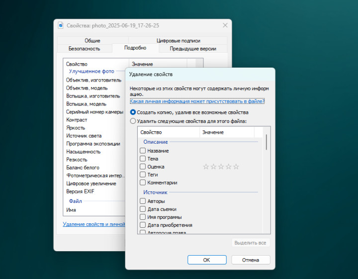 На ПК с Windows есть встроенный инструмент для удаления метаданных: выбираем интересующий файл и вызываем контекстное меню. Кликаем на Свойства — вкладка Подробно — Удалить свойства и личную информацию. Можно убрать всё или только выбранные поля.