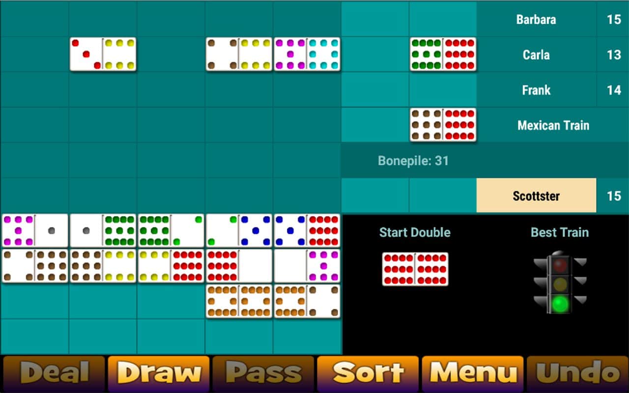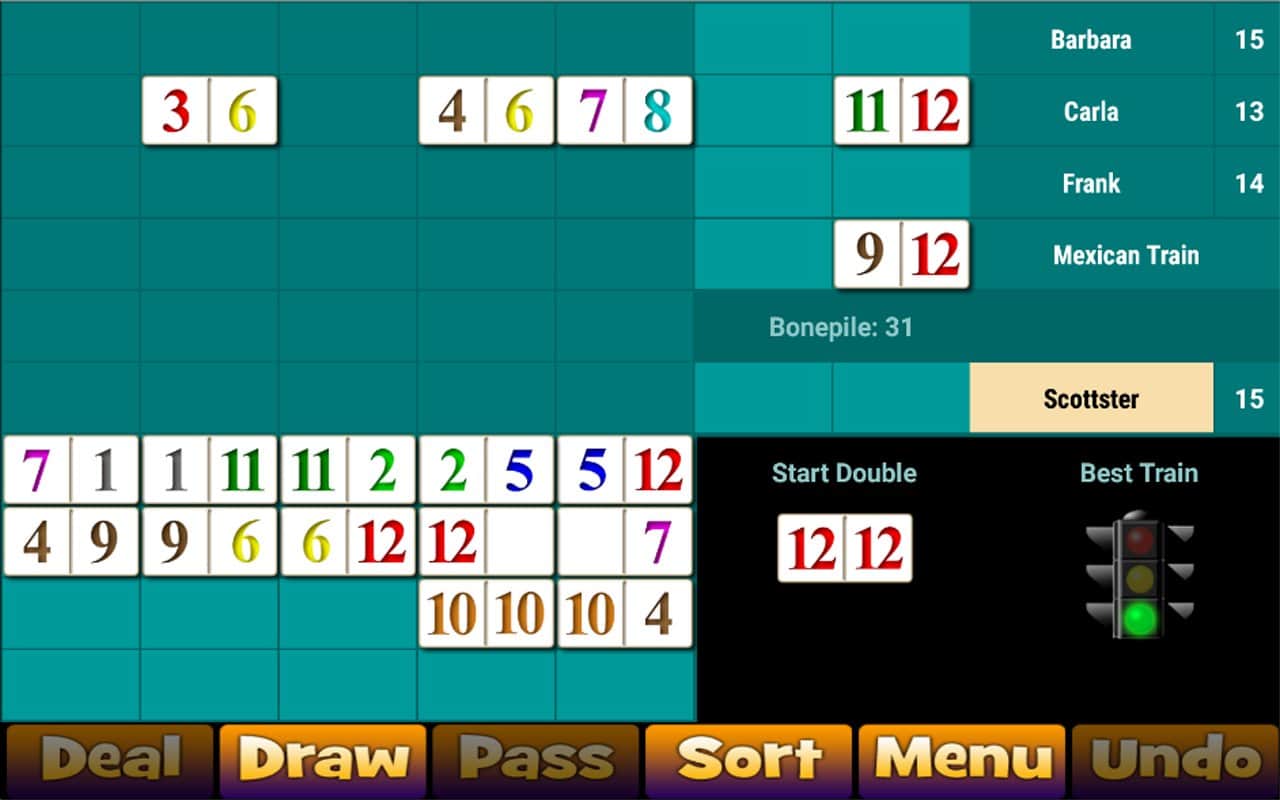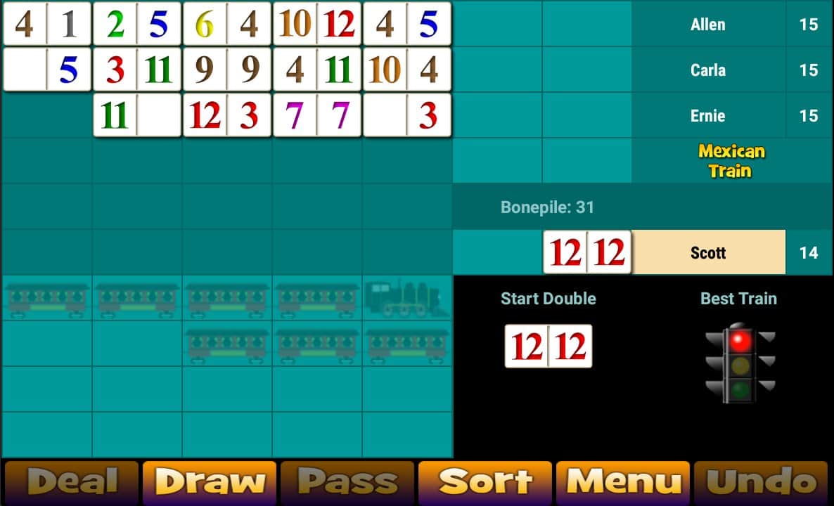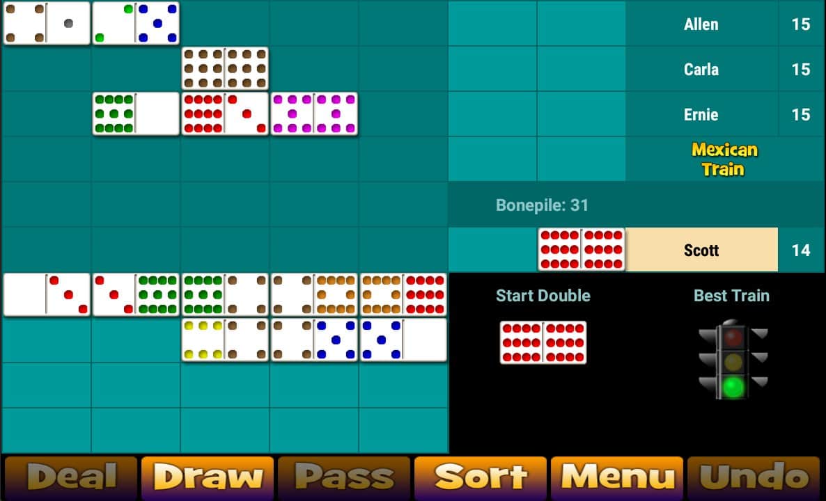 Mexican Train Dominoes 2 – увлекательная настольная игра на андроид, где вы будете играть в мексиканское домино. В этой игре вы будете выступать против трех компьютерных противников и вашей задачей будет быстрее соперников разложить на игровом поле все свои фишки. Эта обновленная версия игры содержит множество вариантов правил и дополнительных опций. Играйте в эту игру в любое свободное время и весело проводите его стараясь обыграть опытных соперников. Заходите в настройки и меняйте компьютерных игроков, скорость игры и показ вместо точек цифры.