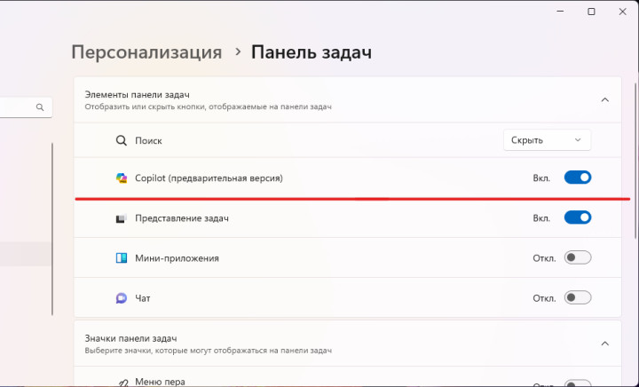 Удалить Windows Copilot с панели задач