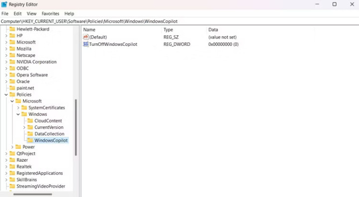 Удалить Windows Copilot из редактора реестра