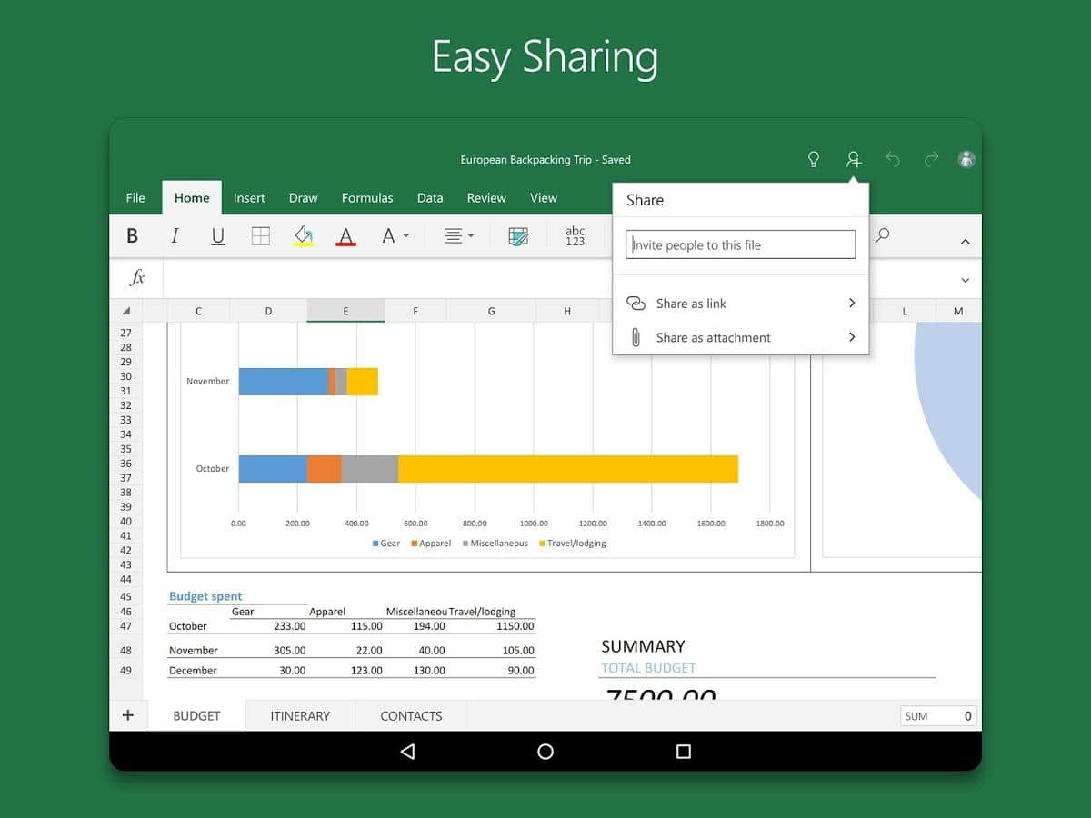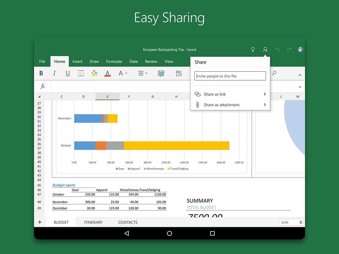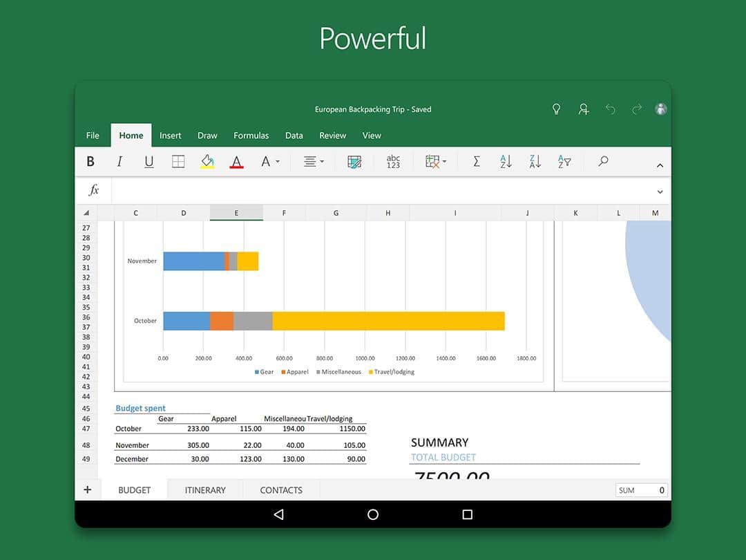Microsoft Excel - Довольно известная программа пользователям на ПК, которая создана для просмотра, создания и редактирования электронных таблиц теперь и на андроид! В приложении реализованы основные функции просмотра, создания и редактирования документов на планшетах с размером экрана 10,1 дюйма и меньше. Возможность составления таблиц, диаграмм и отчетов, произведения самых сложных вычислений делает эту программу популярной среди бухгалтеров и экономистов. При этом программа отличается понятным интерфейсом и удобством использования.