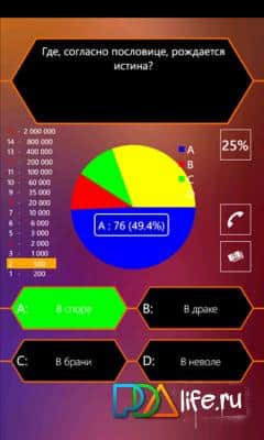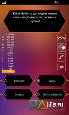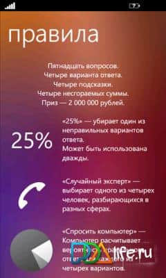 Миллионер - это всем известная игра на windows phone. Отвечайте на вопросы, пользуйтесь подсказками, добирайтесь до последнего вопроса и выиграйте свой первый миллион! В игре более 100 000 вопросов, так что не бойтесь повторений.