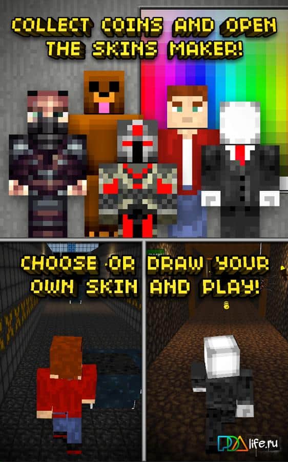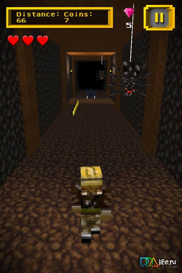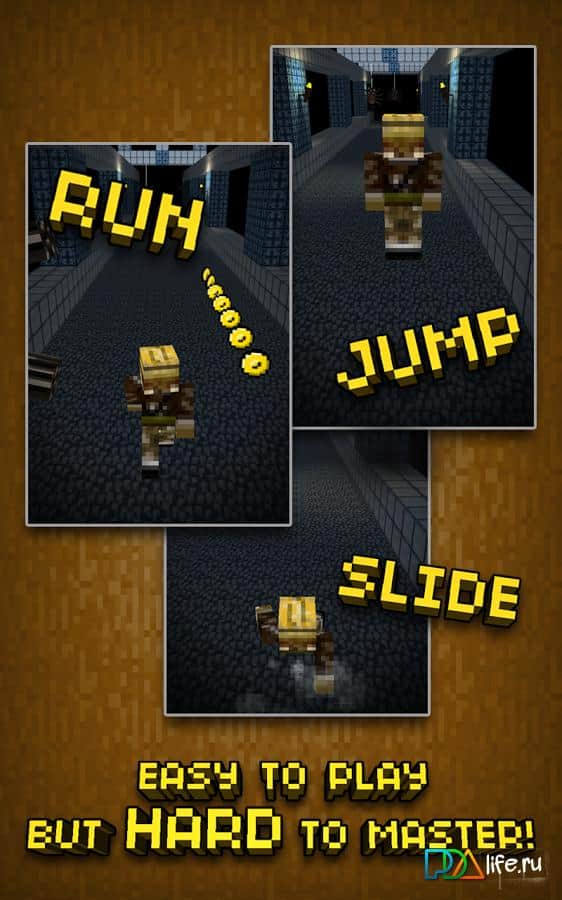 Mine Run 3D - Escape 2 Temple - Очередной android раннер с графикой как у знаменитого Майнкрафта. Вас заточили в темное подземелье одно из храмов, полное опасностей и приключений. Только вы, крошечный храбрый шахтер бежите к выходу через десятки темных туннелей.. Остерегайтесь страшных пауков и ищите алмазы и монеты. Если наберете 1000 монет, откроете дополнительный режим.