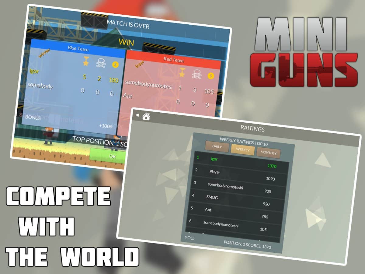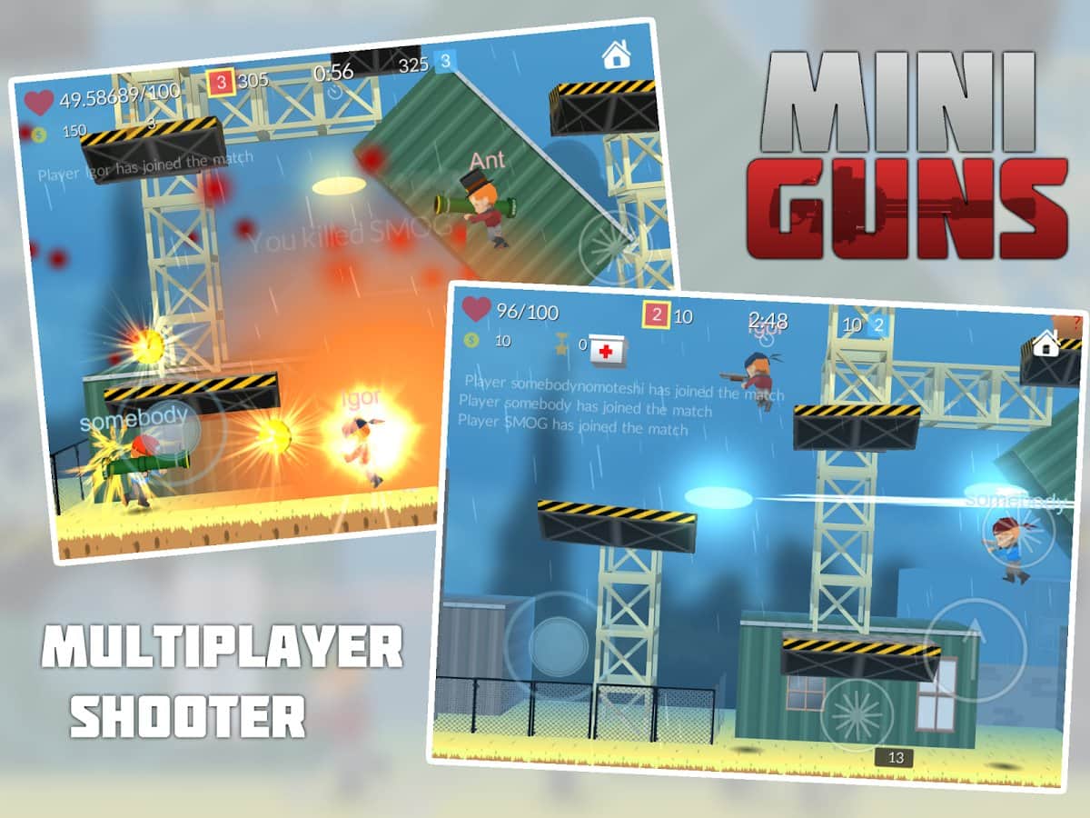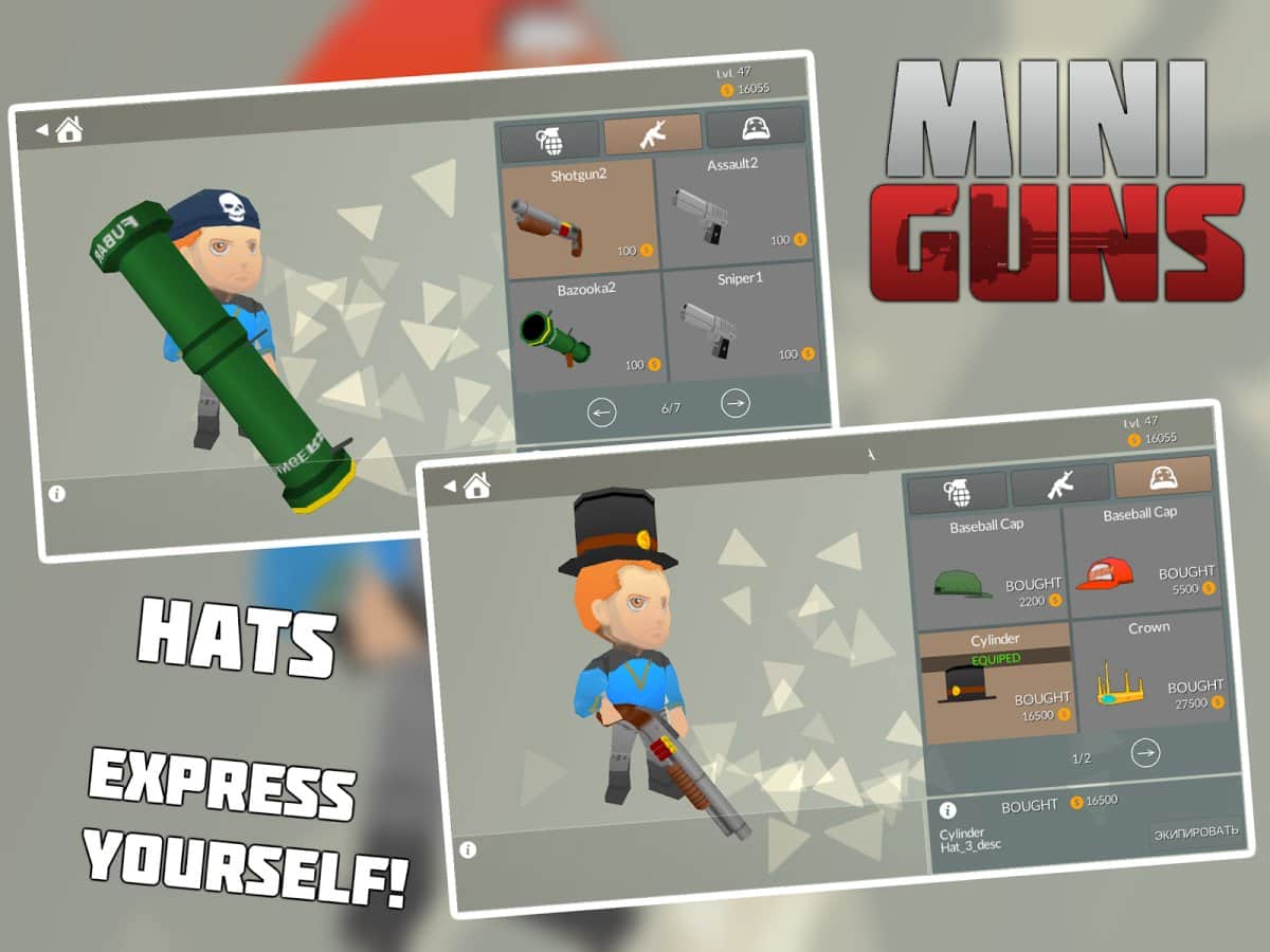 MINI GUNS: Online Shooter – многопользовательский онлайн шутер на андроид, в котром вам предстоит сражаться на арене. Выбирайте себе понравившегося героя, подбирайте для него подходящее оружие и отправляйтесь в бой со своими друзьями, сражаясь на арене. Вас ждет большой ассортимент различного оружия от гранатомета до пистолетов, много веселья и стремительный режим этой игры. Создайте свою бригаду из друзей и нападайте на соперников, не давая им не одного шанса на спасение. Улучшайте вашего героя, меняя его оружие от боя к бою, а также одевайте его в смешные костюмчики и шапочки.