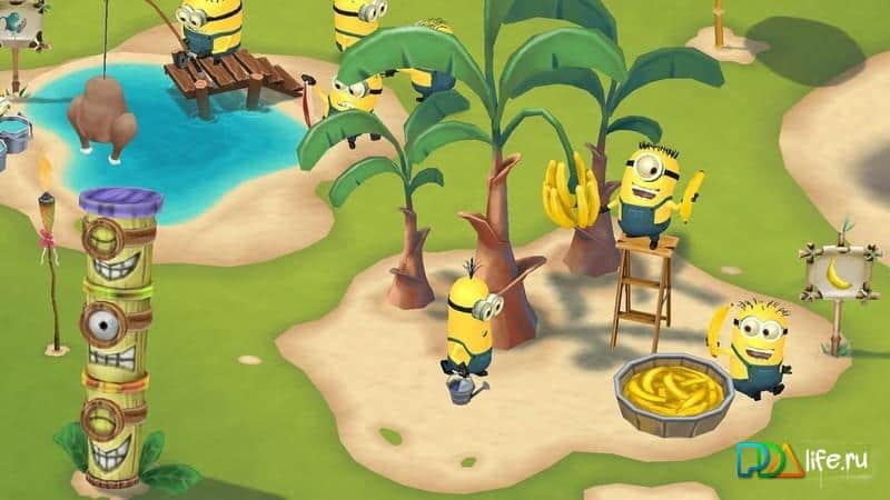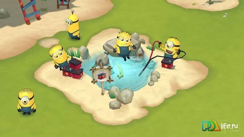 Minions Paradise – стратегия на Андроид, в которой вы попадете на невероятный остров миньонов. Наш небольшой герой по имени Фил случайным образом потопил круизный катер, на котором все миньоны путешествовали по миру. Попав на необитаемый остров, наш герой решает построить здесь курортный остров с различными развлечениями для своих друзей. Займитесь строительством лыжной базы, гидромассажных ванн, гамаков, площадок для пляжного волейбола и других зон для отдыха, а также не забудьте облагородить территорию, сажая деревья и кустарники. Постройте свой рай на необитаемом острове и делитесь своими успехами с друзьями.