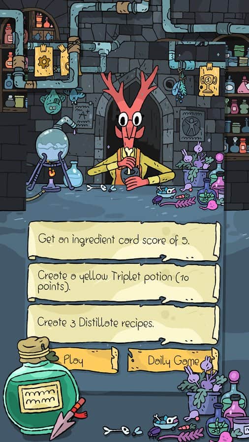 Miracle Merchant - Вы безумец который только и делает что варит различные отвары да зелья. Ваша задача весьма проста и забавна, нужно создавать различные зелья и свитки путем комбинирования различных карт. В начале игры вам расскажут как именно комбинируются карты по цветам, какие бонусы имеют а так же многое другое. Игра по сути практически бесконечная и вам нужно делать зелья среднего или хорошего качества, если у вас получиться слишком плохое зелье то вы проиграете.