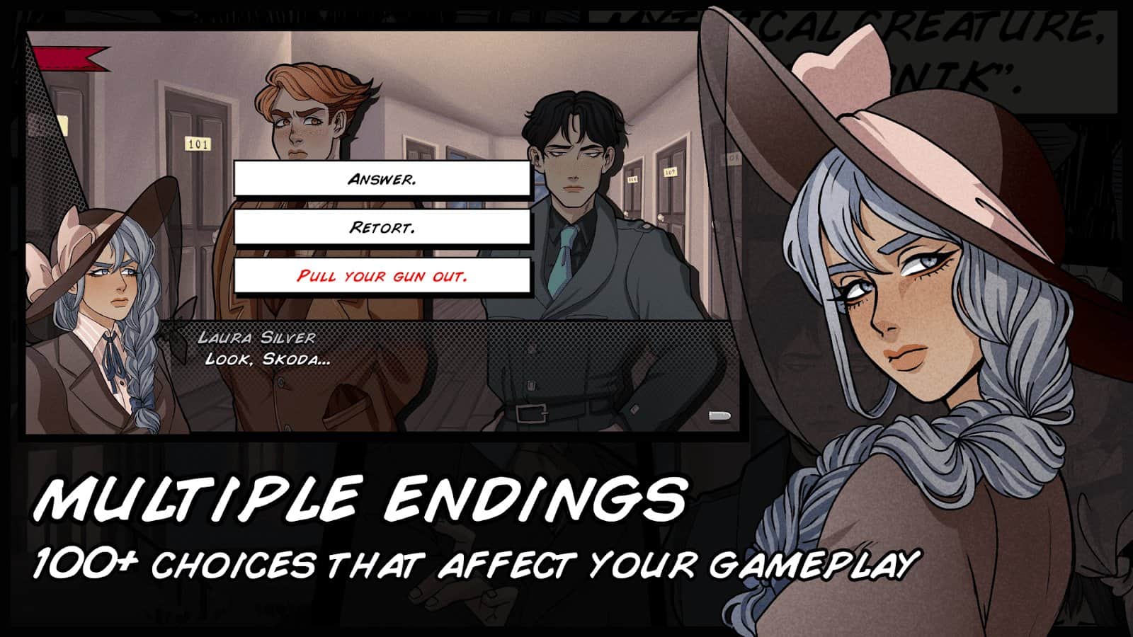 Misadventures of Laura Silver: Visual Novel – аниме-визуальный роман на андроид, где вы будете выступать в роли детектива. В этой игре вы познакомитесь с Лаурой Сильвер – детективом которому выпала опасная миссия по расследования громкого дела Водника. Возьмите под свой контроль главную героиню и исследуйте все вокруг отеля где произошло убийство и допросите всех свидетелей. Выполняйте многочисленные миссии и задания ища улики и доказательства. Играйте в мини-игры, решайте головоломки и любыми путями повлияйте на дальнейший сюжет игры. В игре вы найдете несколько концовок и множество вариантов развития сюжета. Раскройте запутанное дело и станьте легендарным детективом.
